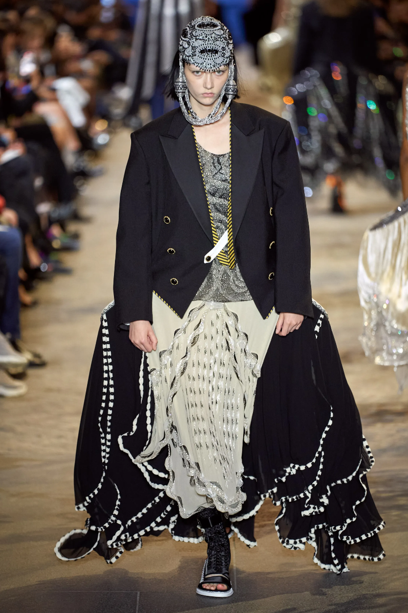 在 Loewe,同样的情景同样经由 Jonathan Anderson 之手被赋予全新的表现形式。Jonathan Anderson 在巴黎市中心历史悠久的 La Garde Républicaine 马术竞技场举办了新季时装秀,也因此,Jonathan Anderson 将系列描述为一次对品牌的“文艺复兴”。在设计上,他遵循一种听从内心的随机性,让各种常见廓形进行重新建构,从而呈现全新的甚至是有点怪异的服装形态;金色胸甲与螺纹针织长裙进行了结合,带来强烈的视觉冲击力。