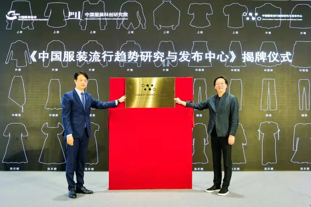 中国服装流行趋势研究与发布中心揭牌仪式成功举办。中国服装协会常务副会长杨金纯、杭州艺尚小镇运营发展有限公司董事长郑念华一同上台为中心揭牌。