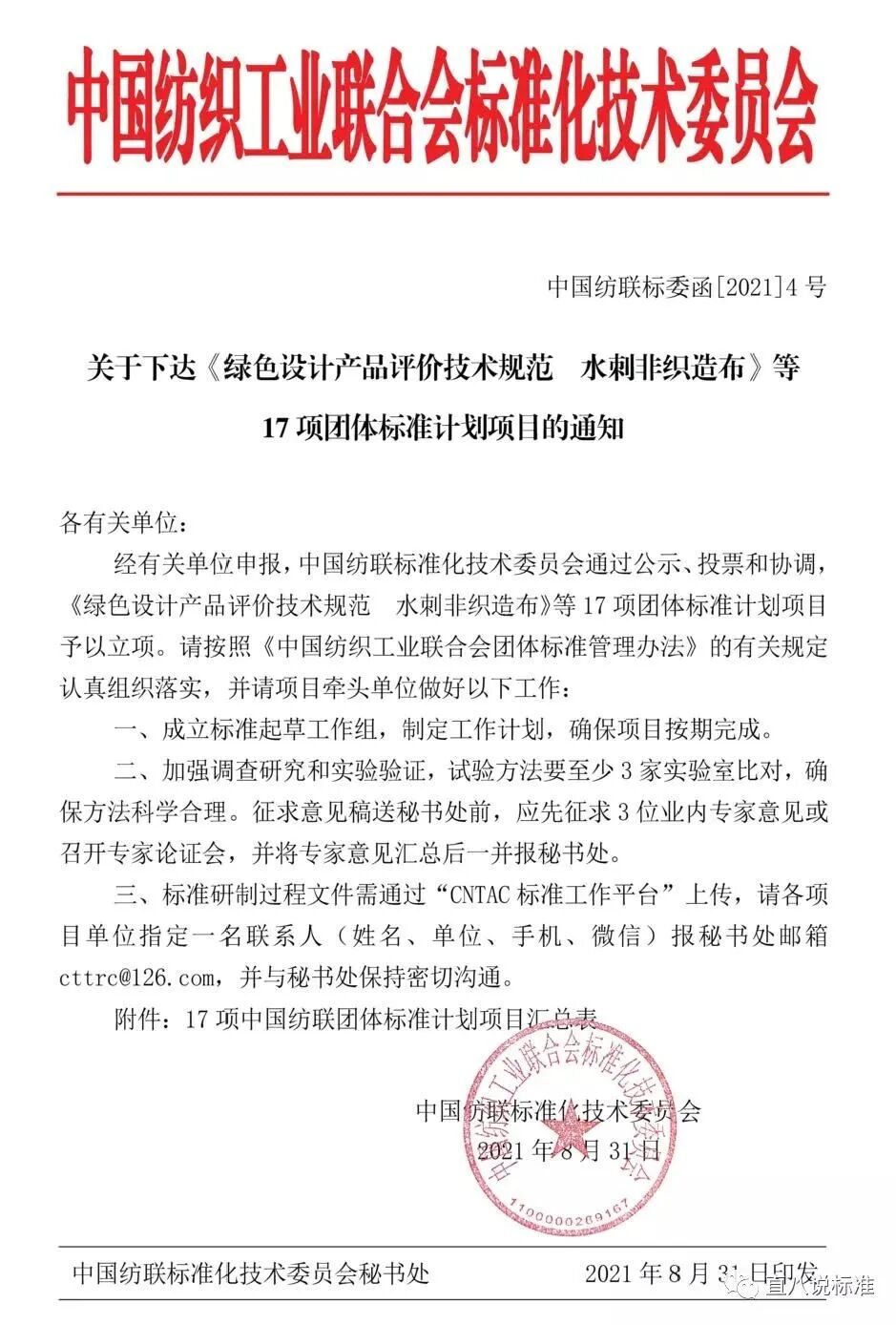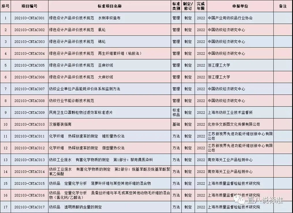 17项团体标准计划项目中,绿色设计产品评价技术规范 水刺非织造布、氨纶、锦纶、再生纤维素纤维(粘胶法)、亚麻纱线、大麻纱线6项,纺织企业单位产品能耗评价体系和监测方法与纺织行业节能诊断技术规范2项,纺织工业废水与纺织品中有害物测定、化学纤维热释放速率等7项。《汉服着装指南》作为《汉服》的配套标准开始制定。此外,作为民用卫生口罩颗粒物过滤效率测试校准用的标准滤片(标准样品)正式立项研制。