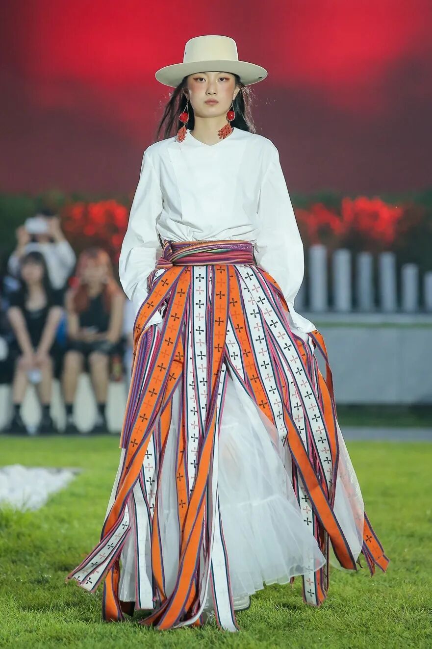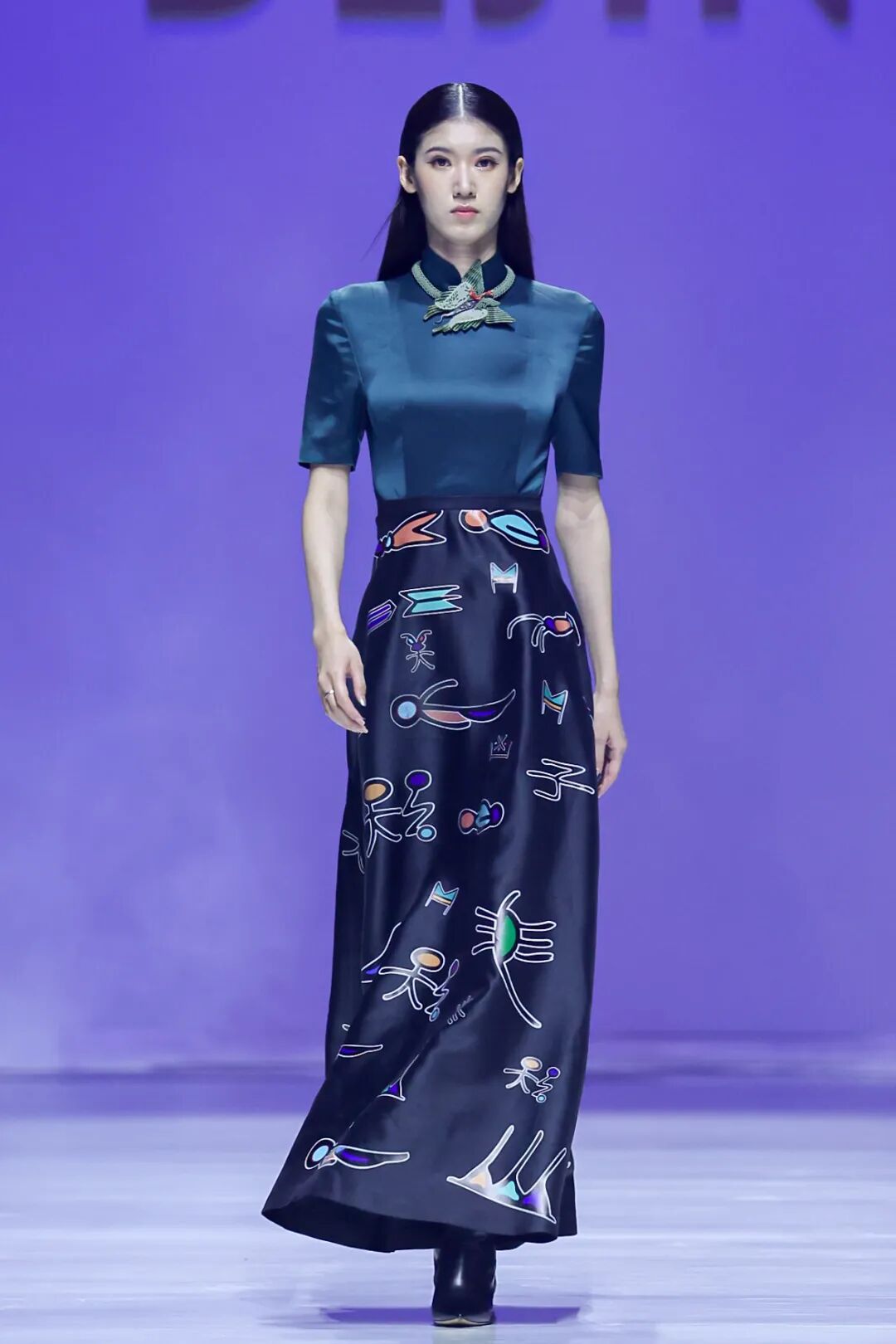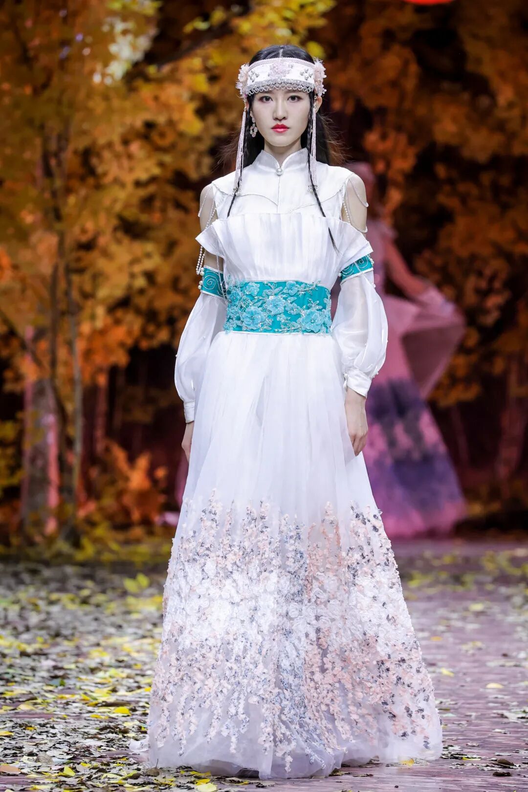 与此同时,本季时装周还呈现出百花齐放的民族文化,如德锦的纳西族、天山的新疆民族、中元素的瑶族、蕃巴秀的藏族,以及金景怡的鄂伦春族文化,以民族文字、风情、图案、习俗,讲述不同民族的故事。
