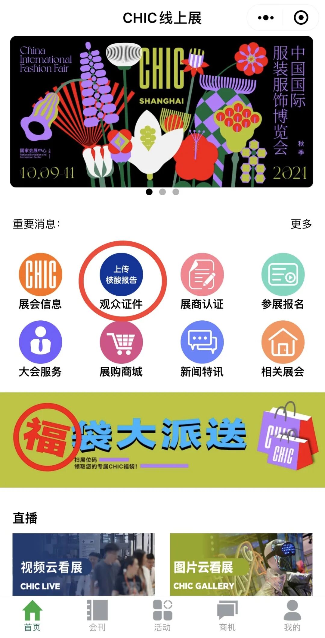 打开“CHIC线上展”小程序,首页点击“观众证件”,上传48小时内核酸检测报告,方可入馆参观。