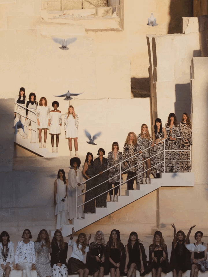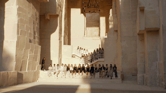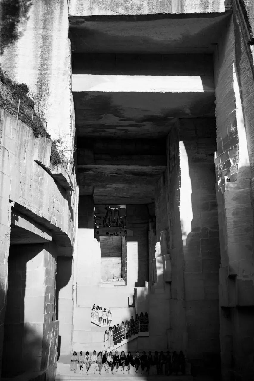 女孩们在岩石之间漫步,时髦的摩登女郎与历史古迹对话,产生了戏剧张力。最终模特们并肩坐在石阶上,放飞白鸽,象征着对和平未来的期待,历史、现在、未来在这一刹那交汇。