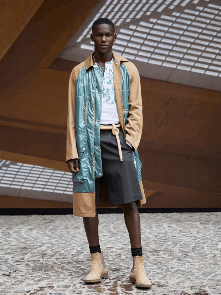 Hermès 在本季展现了一个轻盈、放松和充满自由之感的系列,不同的面料在此相互交织,技术创新从手工艺传统中汲取灵感,纸张变成织物,Toilbright 面料与棉布外层融合,鲜活色彩及缝线图案为皮革增添生机。