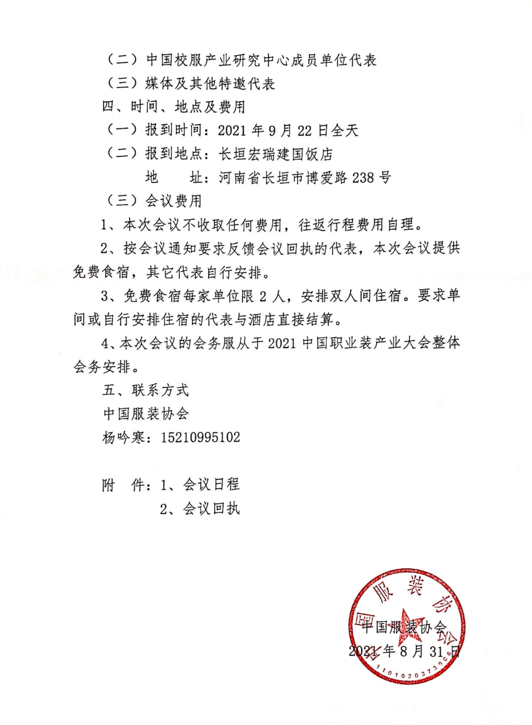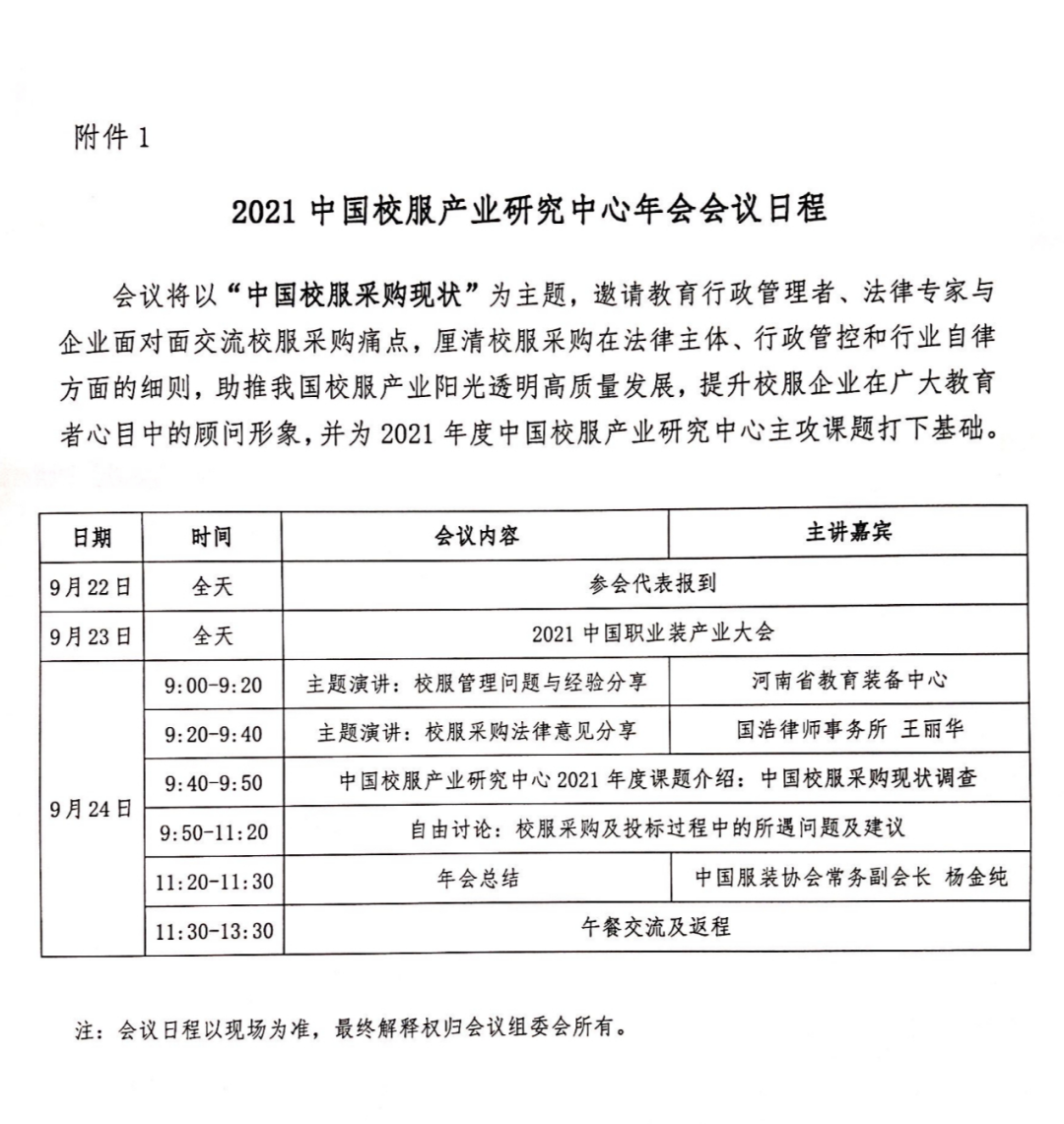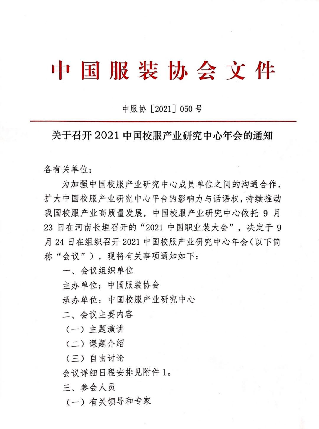 2021中国校服产业研究中心年会于9月24日在河南长垣召开。为了充分发挥中国校服产业研究中心行业推动作用,共同探讨我国校服产业现存问题,加强校服企业之间的互动交流,为广大中小型校服企业提供深入服务, 2021中国校服产业研究中心年会现面向广大校服企业发出参会邀请,欢迎各校服企业代表积极参会。