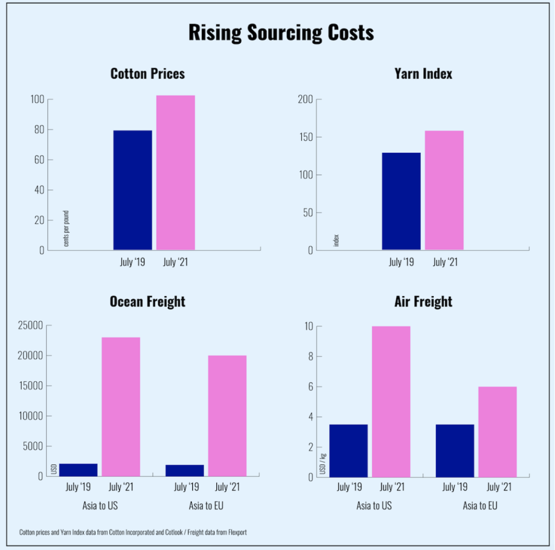 自全球贸易在去年第二季度开始迎来复苏之后,服装制造业的全球采购成本就持续攀升。从最源头的原料、劳动力成本的增加,到航运成本的一路飙升,再到各主要服装鞋帽生产大国因疫情反复所导致的产能不足,时尚产业正面临着供需不平衡的发展困局。