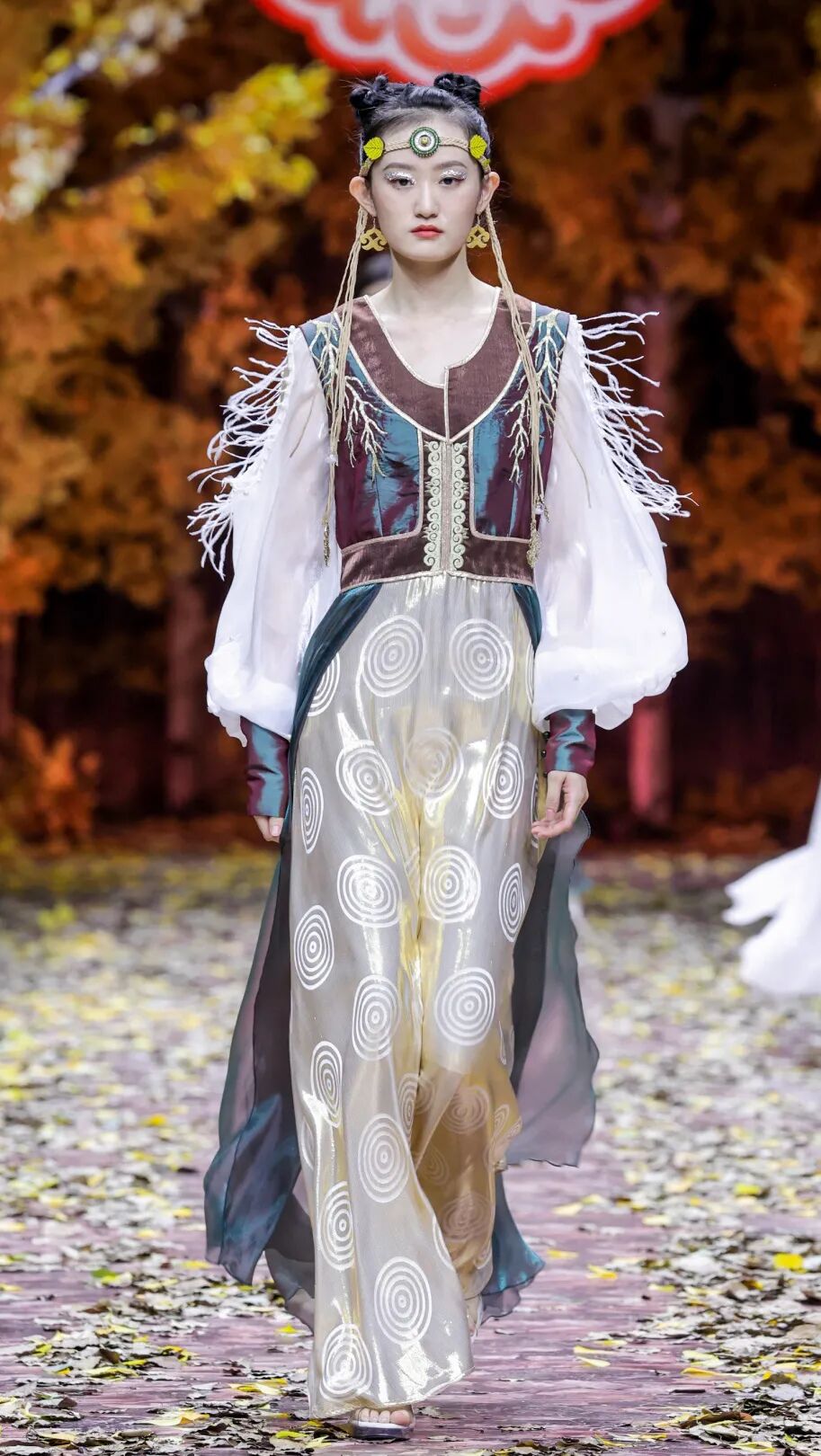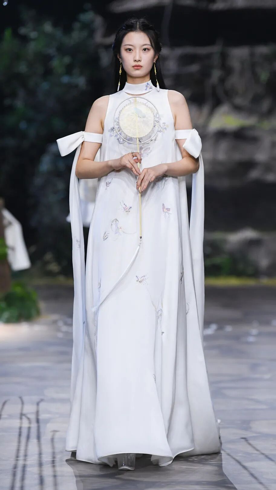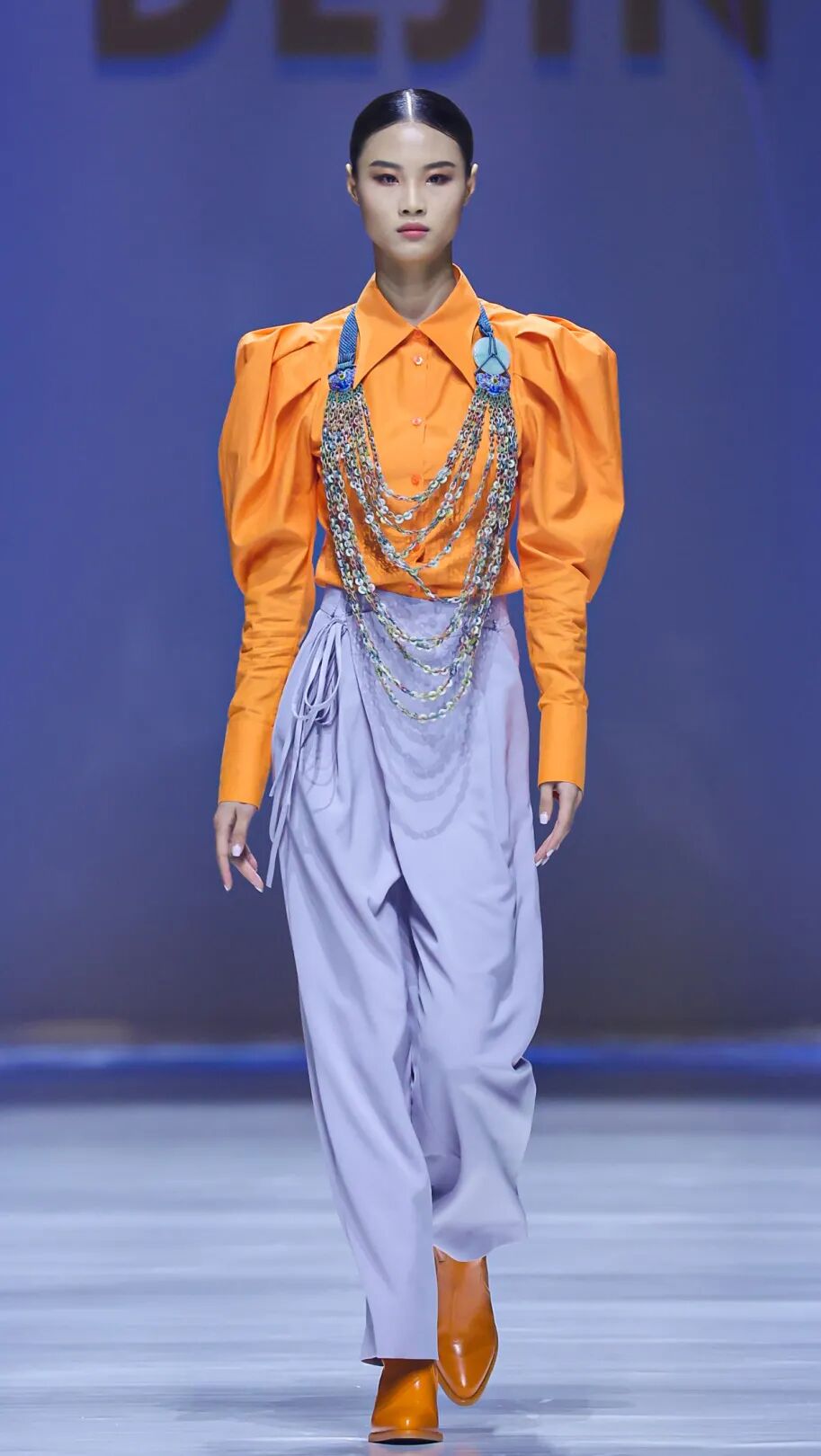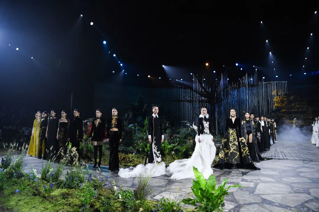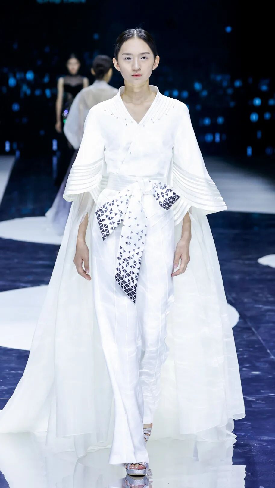 设计师计文波从唐卡中提取灵感,采用提花、定位花、刺绣、活性印染等高精工艺阐述敦煌文化,携其品牌JIWENBO PRIVE呈现了一场包罗东方根骨与西方情韵的大秀;设计师丁洁从《山海经》中获取面料设计灵感,将蛇纹图腾进行时尚演练,将真丝与特种面料碰撞,传递D.MARTINA QUEEN品牌“尚衣下裳”的职场女装新风尚;设计师兰天巧妙地将服饰与建筑学中榫卯结构结合,流畅自然的廓形塑造、细腻的结构雕琢、舒适的面料选择,为高级时装品牌MoHanYun赋予外柔内刚的女性气质;中元素则取源岭南瑶族风情,把瑶族的图腾文化元素与青年审美相结合,展示一种年轻态的“潮文化”。