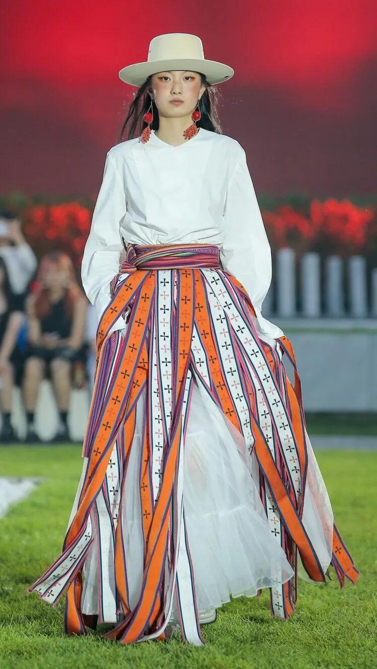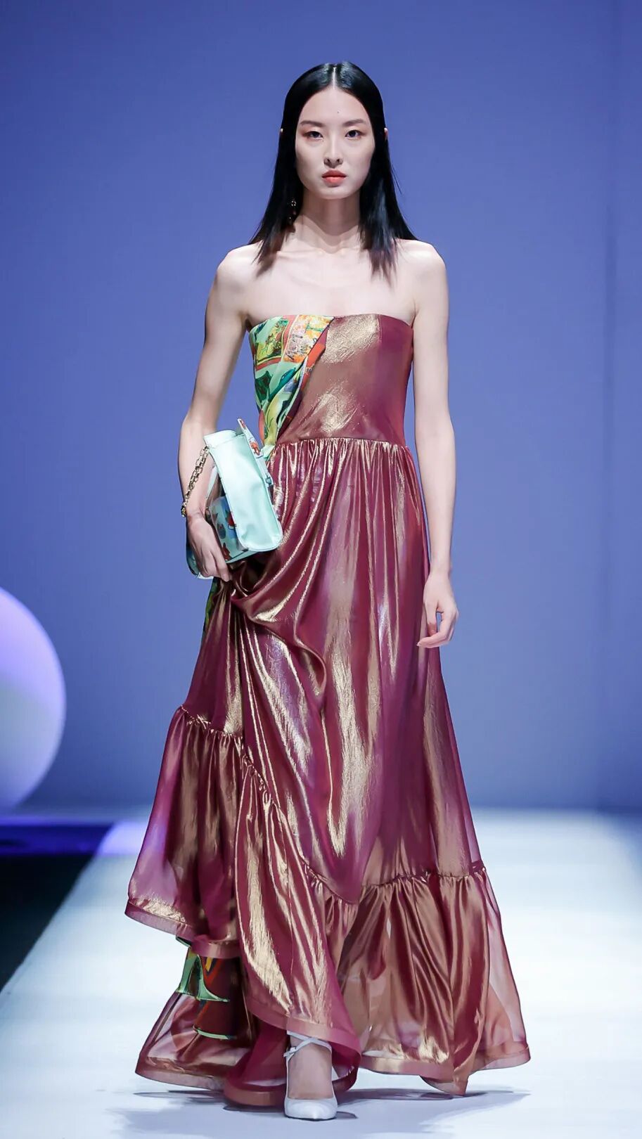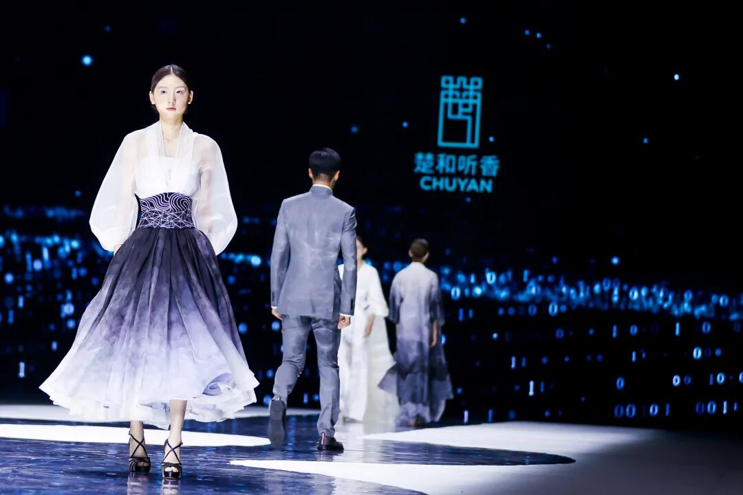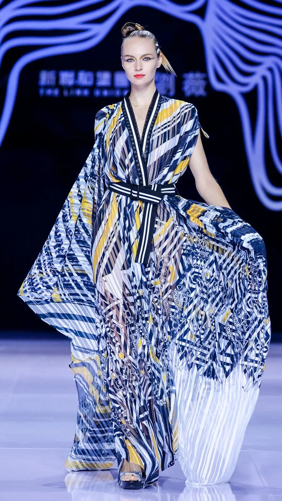 设计师计文波从唐卡中提取灵感,采用提花、定位花、刺绣、活性印染等高精工艺阐述敦煌文化,携其品牌JIWENBO PRIVE呈现了一场包罗东方根骨与西方情韵的大秀;设计师丁洁从《山海经》中获取面料设计灵感,将蛇纹图腾进行时尚演练,将真丝与特种面料碰撞,传递D.MARTINA QUEEN品牌“尚衣下裳”的职场女装新风尚;设计师兰天巧妙地将服饰与建筑学中榫卯结构结合,流畅自然的廓形塑造、细腻的结构雕琢、舒适的面料选择,为高级时装品牌MoHanYun赋予外柔内刚的女性气质;中元素则取源岭南瑶族风情,把瑶族的图腾文化元素与青年审美相结合,展示一种年轻态的“潮文化”。