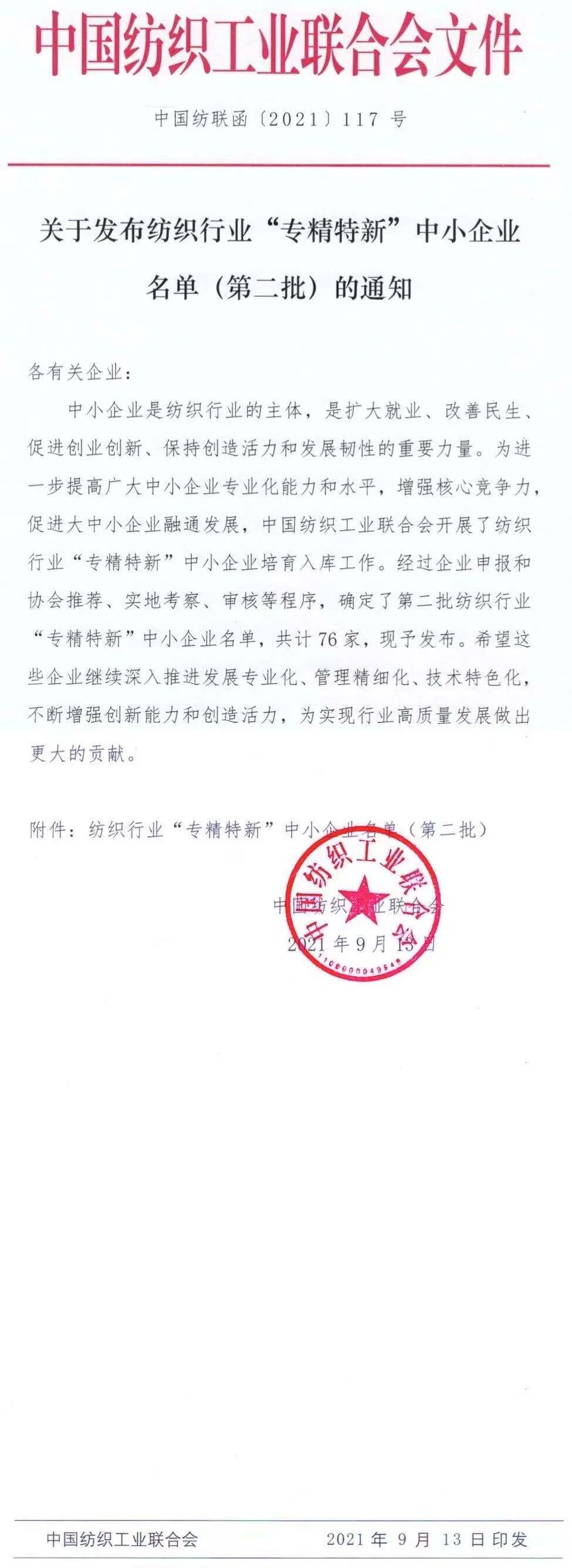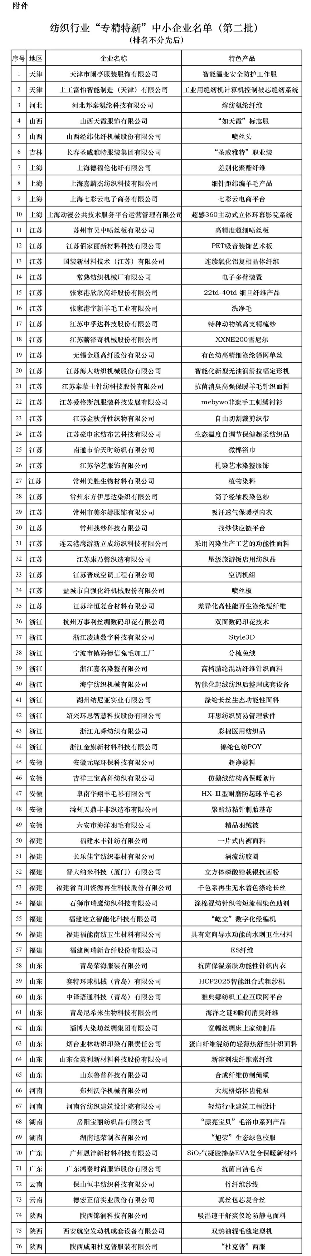 为进一步提高广大中小企业专业化能力和水平,增强核心竞争力,促进大中小企业融通发展,中国纺织工业联合会开展了纺织行业“专精特新”中小企业培育入库工作。经过企业申报和协会推荐、实地考察、审核等程序,确定了第二批纺织行业“专精特新”中小企业名单,共计76家,现予发布。