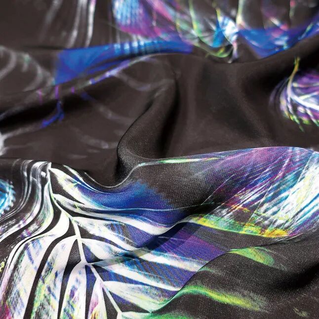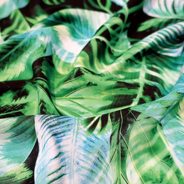 自然空间在科学技术飞速发展的当下有了更多角度的诠释,数字化滤镜效果的加持也让自然外观有了更多新颖的有机形态,呈现超现实的外观效果。可以采用数字化的光学滤镜和高饱和的技术感色彩打造奇幻感的自然图案,如灯管叶茎、漩涡花卉、迷幻森林等。暗底色面料可以采用数码印工艺来全幅满印,打造失真的光学自然世界,为面料图案的设计带来更为前卫时尚的风格。