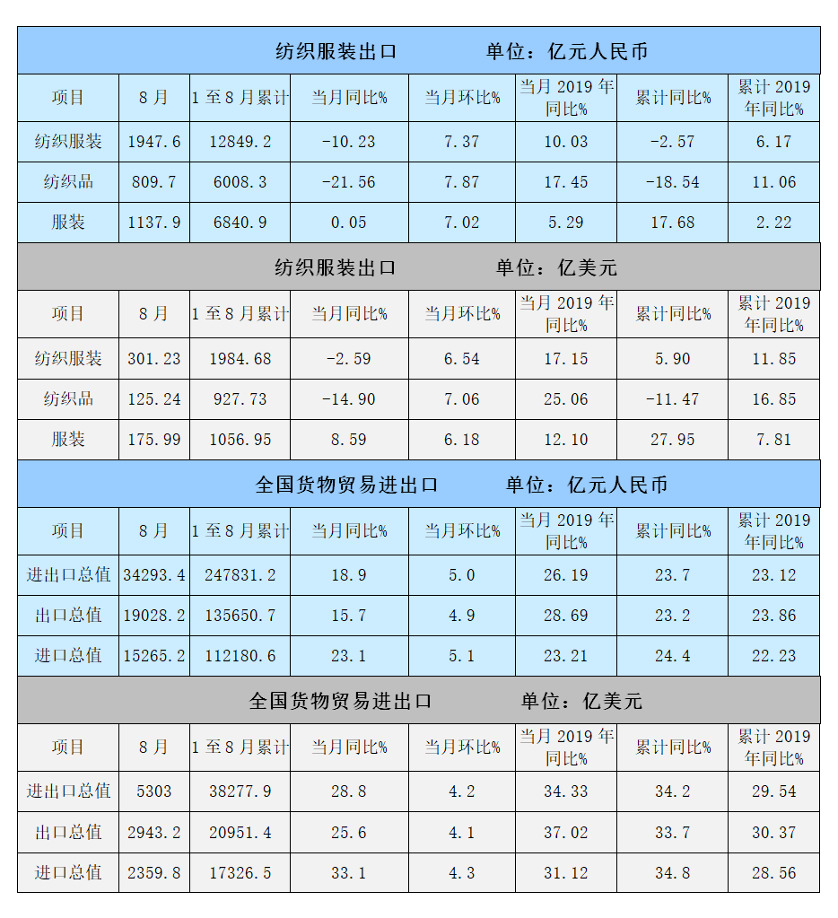 8月,纺织服装出口1947.6亿元,下降10.23%,环比增长7.37%,比2019年同期增长10.03%,其中纺织品出口809.7亿元,下降21.56%,环比增长7.87%,比2019年同期增长17.45%,服装出口1137.9亿元,增长0.05%,环比增长7.02%,比2019年同期增长5.29%。