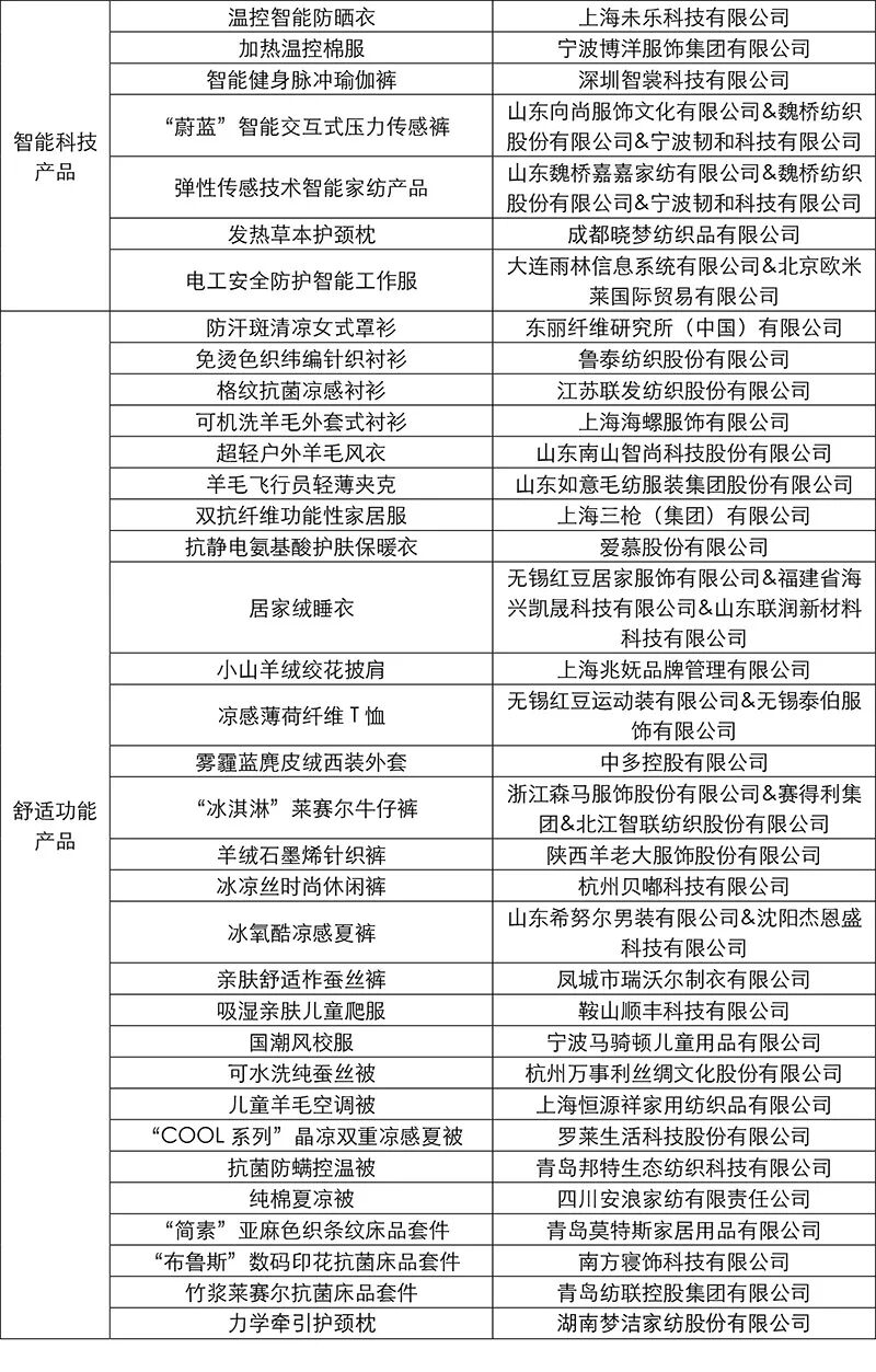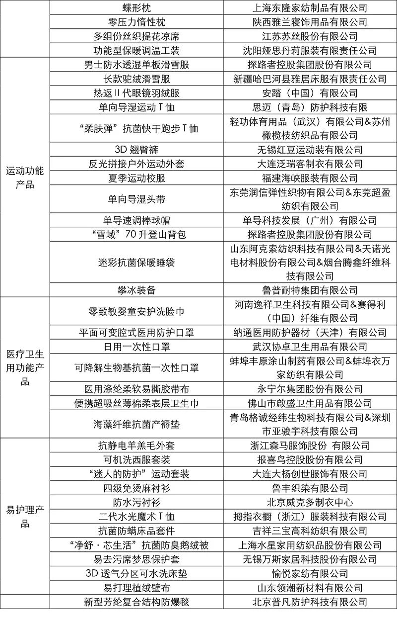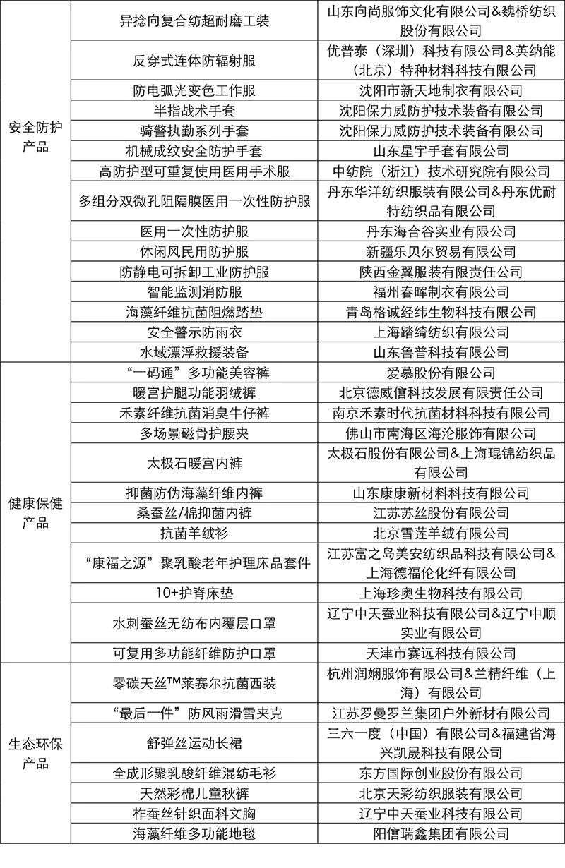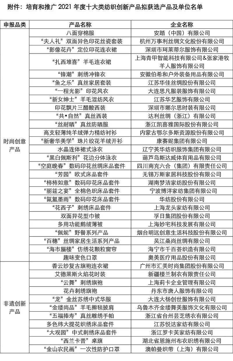 附件:培育和推广2021年度十大类纺织创新产品拟获选产品及单位名单