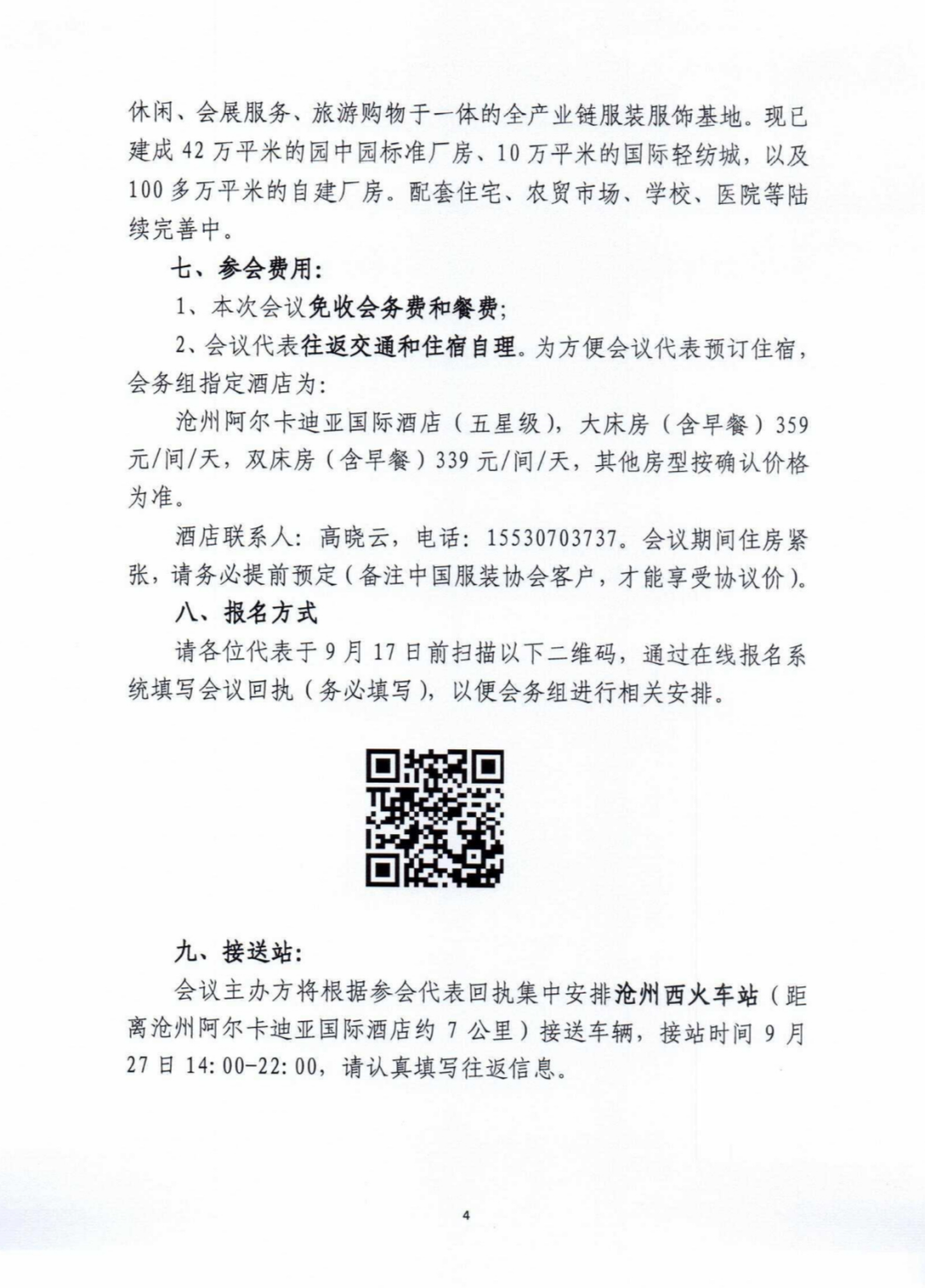 2、会议代表往返交通和住宿自理。为方便会议代表预订住宿,会务组指定酒店为:沧州阿尔卡迪亚国际酒店(五星级),大床房(含早餐)359元/间/天,双床房(含早餐)339元/间/天,其他房型按确认价格为准。酒店联系人:高晓云,电话:15530703737。会议期间住房紧张,请务必提前预定(备注中国服装协会客户,才能享受协议价)。八、报名方式