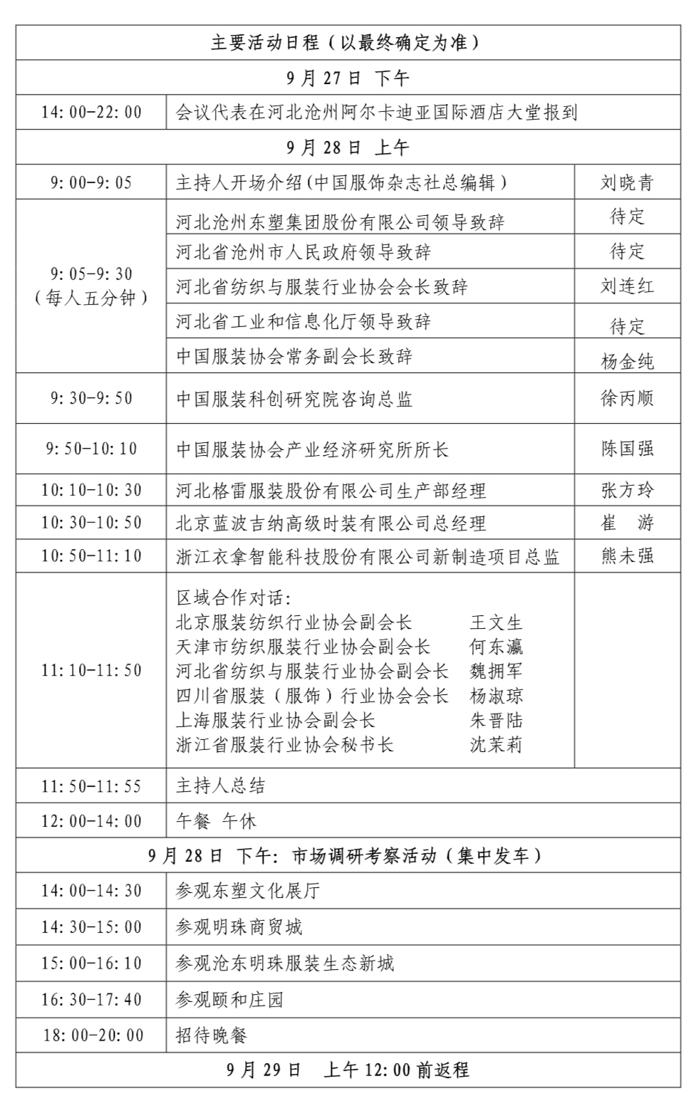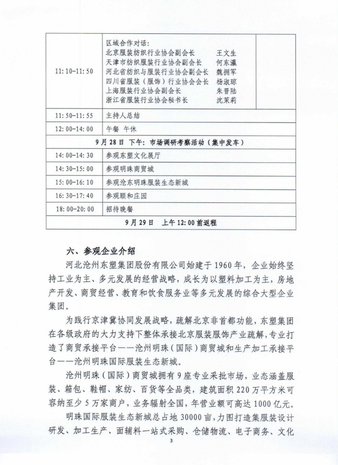 河北沧州东塑集团股份有限公司始建于1960年,企业始终坚持工业为主、多元发展的经营战略,成长为以塑料加工为主,房地产开发、商贸经营、教育和饮食服务业等多元发展的综合大型企业集团。为践行京津冀协同发展战略,疏解北京非首都功能,东塑集团在各级政府的大力支持下整体承接北京服装服饰产业疏解,专业打造了商贸承接平台——沧州明珠(国际)商贸城和生产加工承接平台——沧州明珠国际服装生态新城。沧州明珠(国际)商贸城拥有9座专业采批市场,业态涵盖服装、箱包、鞋帽、家纺、百货等全品类,建筑面积220万平方米可容纳至少5万家商户,业务辐射全国,年营业额可高达1000亿元。明珠国际服装生态新城总占地30000亩,力图打造集服装设计研发、加工生产、面辅料一站式采购、仓储物流、电子商务、文化休闲、会展服务、旅游购物于一体的全产业链服装服饰基地。现已建成42万平米的园中园标准厂房、10万平米的国际轻纺城,以及100多万平米的自建厂房。配套住宅、农贸市场、学校、医院等陆续完善中。七、参会费用: