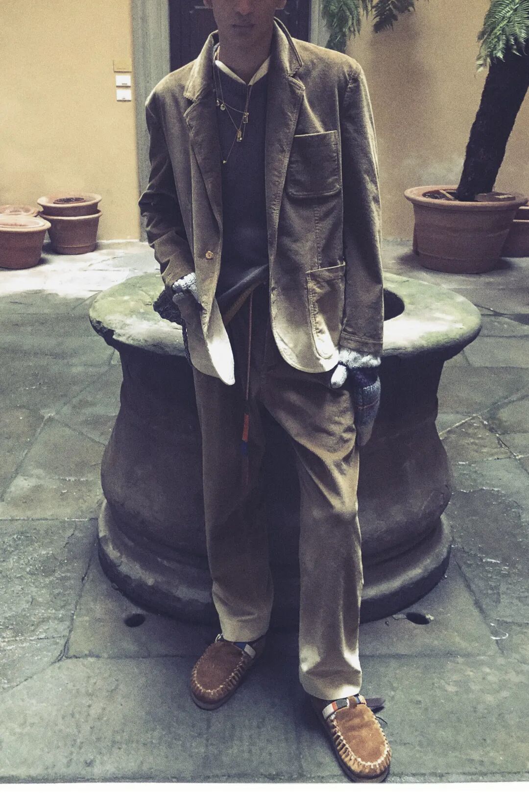 垂坠面料上稍带光泽的自然色调强化了90年代的风格。更大的盖袋和胸袋细节很好地平衡了廓形。