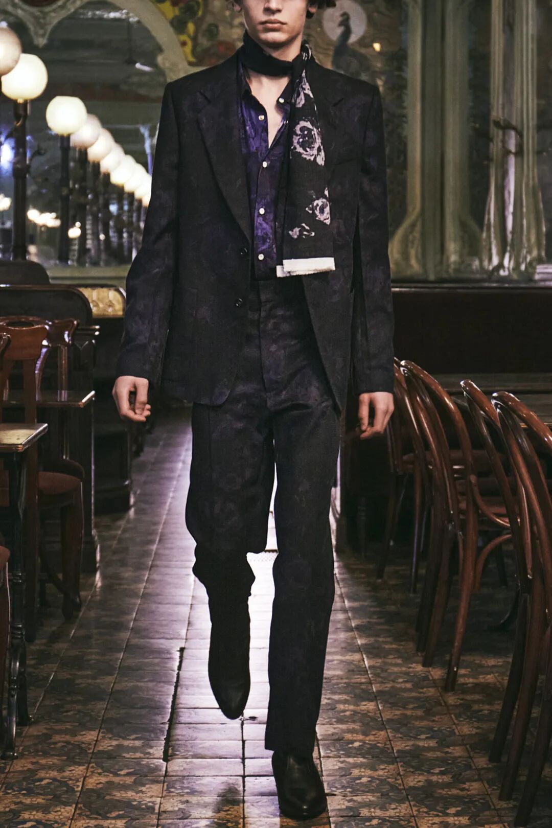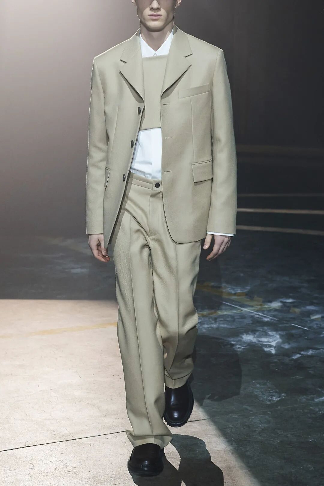 复古风格日益兴起,在2021/22秋冬更有着进一步的发展。借鉴了20世纪60年代到90年代的风格,同时也带有未来主义的韵味,三扣西服通常在设计上有更高的领子止点和更长的大身。