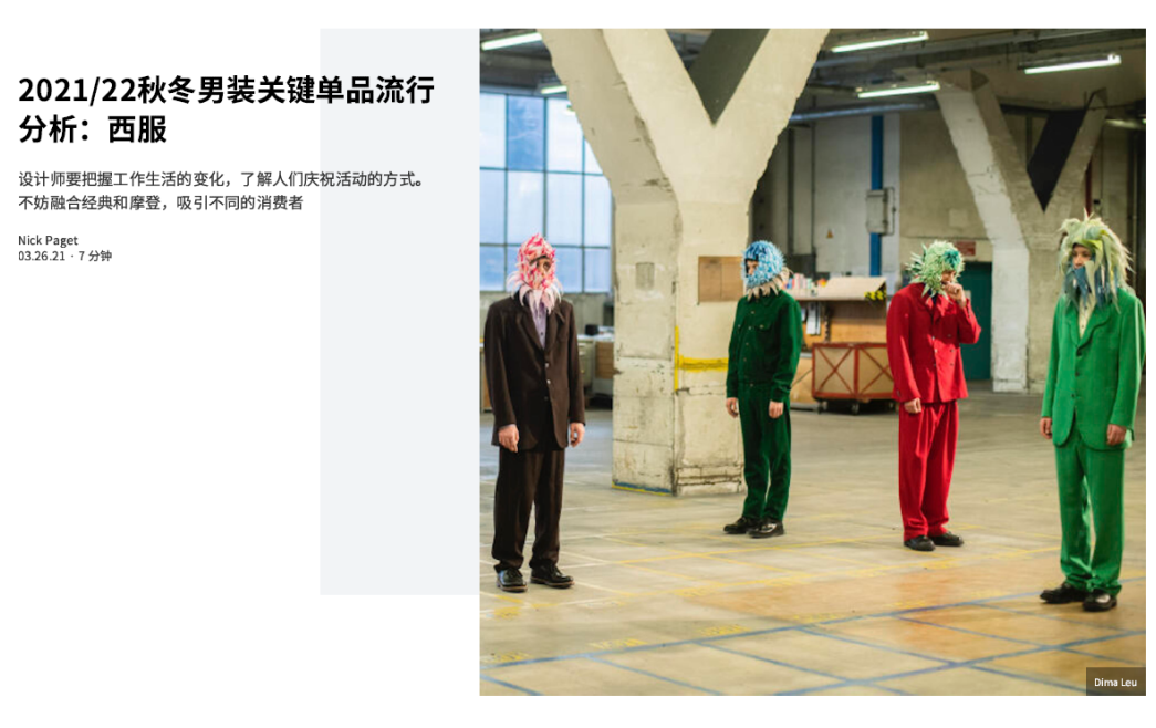 带有吸睛设计细节的便西是时尚品牌重归西服设计的重要渠道,以此吸引部分第一次以时尚单品的角度看待西服的消费者。