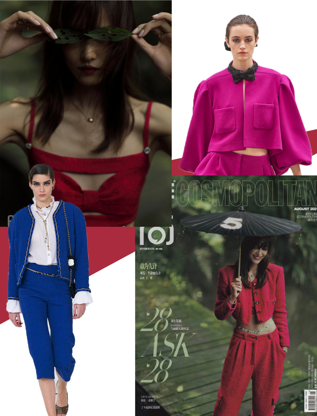 就连设计风格一向简洁、干净的Chanel也将这些明艳的颜色大胆的运用其中。在《时尚COSMO》8月刊封面大片中刘雯便身着一身Chanel F/W2021红色套装。