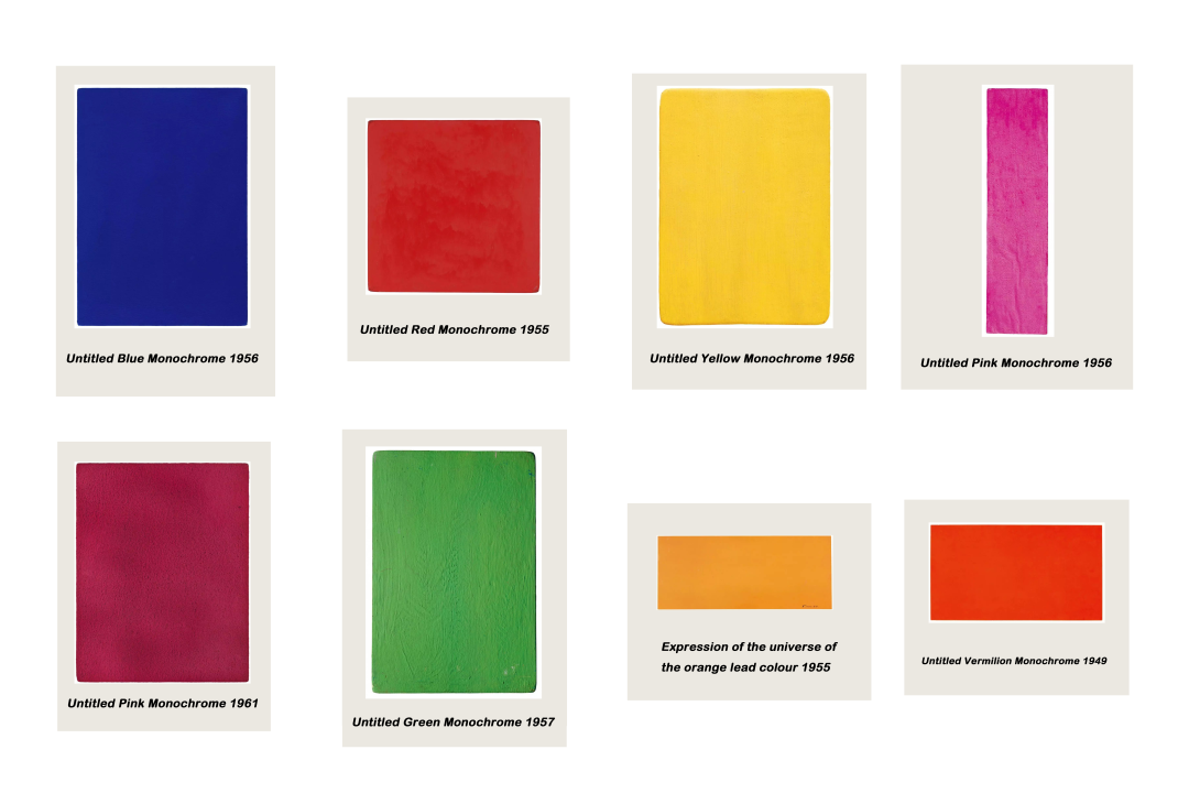 Klein的单色绘画是当黄昏坠落天际的孤寂、是星辰坠入银河的浪漫。在Klein单色画系列里,每张画布上均匀地涂上一种颜色,代表不同的创作地,没有一丝杂质,以极致的抽象向观者传达着力量。