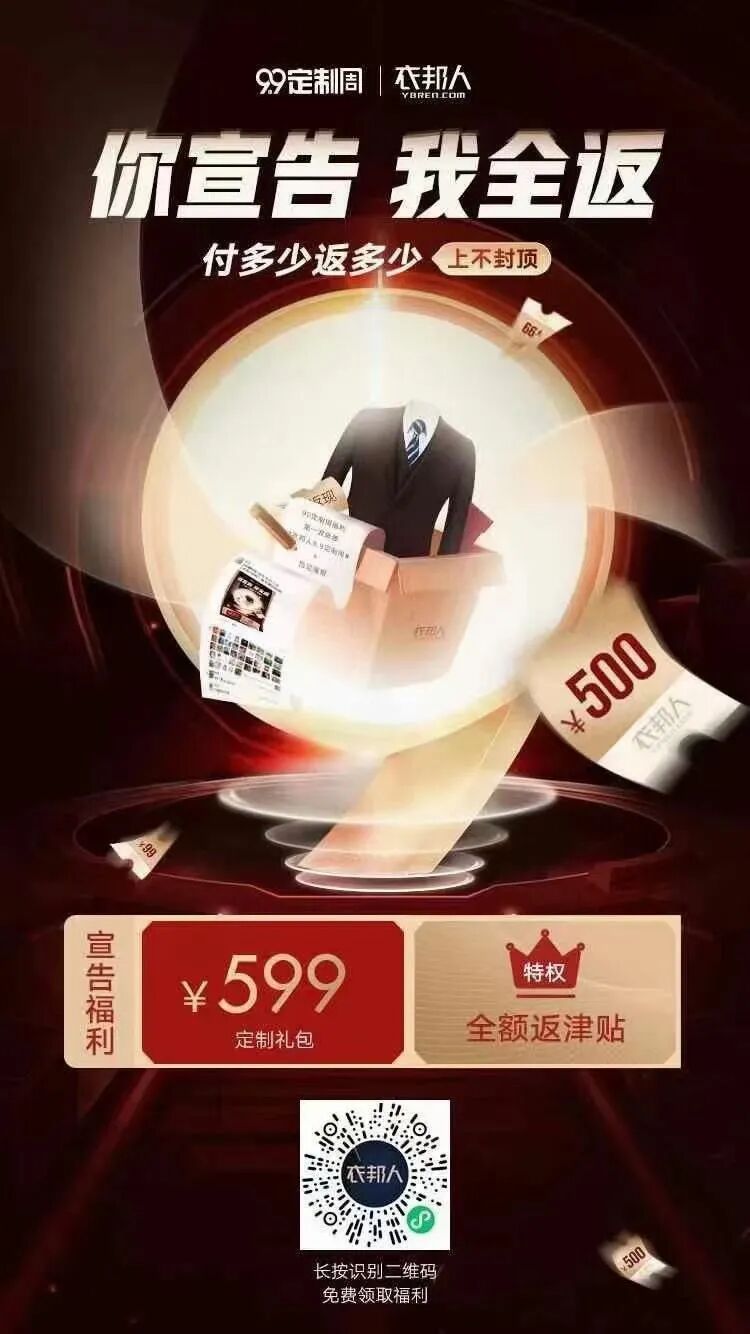 用户宣告即送599元定制券礼包,消费还可获得全额返津贴,上不封顶!!截止8月22日,累计23580名用户已返津贴,预计99定制周结束前参与用户数超5万人!长按图片识别二维码马上参与👇