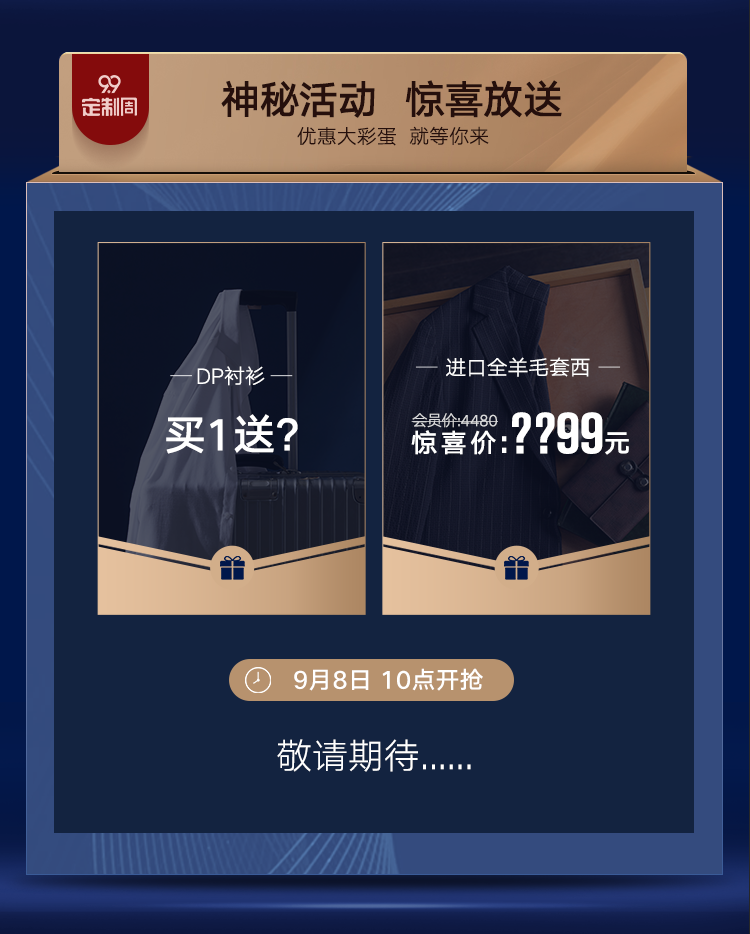 9月8日10点,衣邦人全平台开启神秘惊喜,DP衬衫买1送?,原价4480元进口西服套装低至??99元,敬请期待!