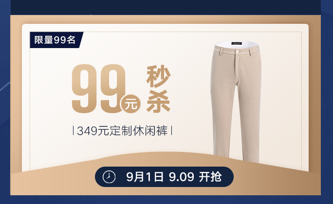 9月1日-9月3日,每日9:09准时开启,99元秒杀定制休闲裤 /羊毛衫/DP衬衫,定制时直接抵扣,数量有限,先到先得!
