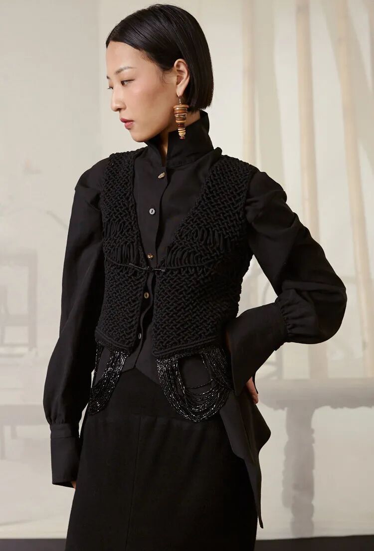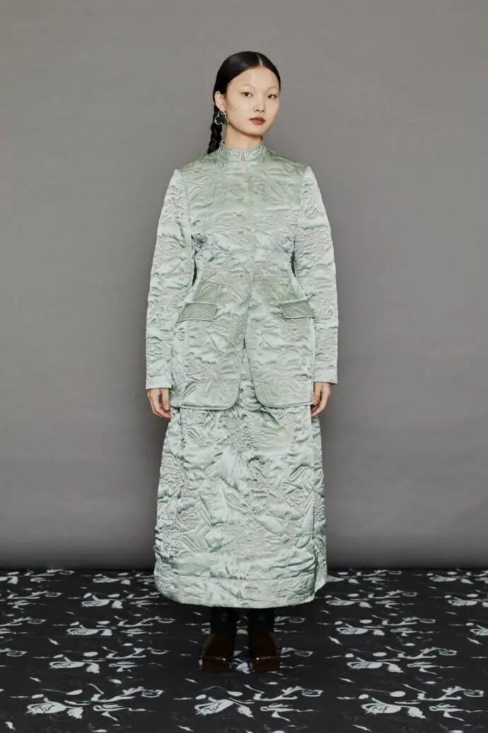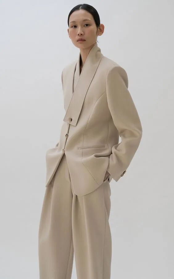 设计要点:保持简约精致的轮廓造型、并在细节和配饰上适当增添女性气质,可搭配流苏和马甲丰富视觉层次。外套适合采用富有传统韵味的羊绒、绗缝或单色提花,而内搭趋于简约,通过垂感面料、宽大袖口或开衩细节来获得飘逸感。