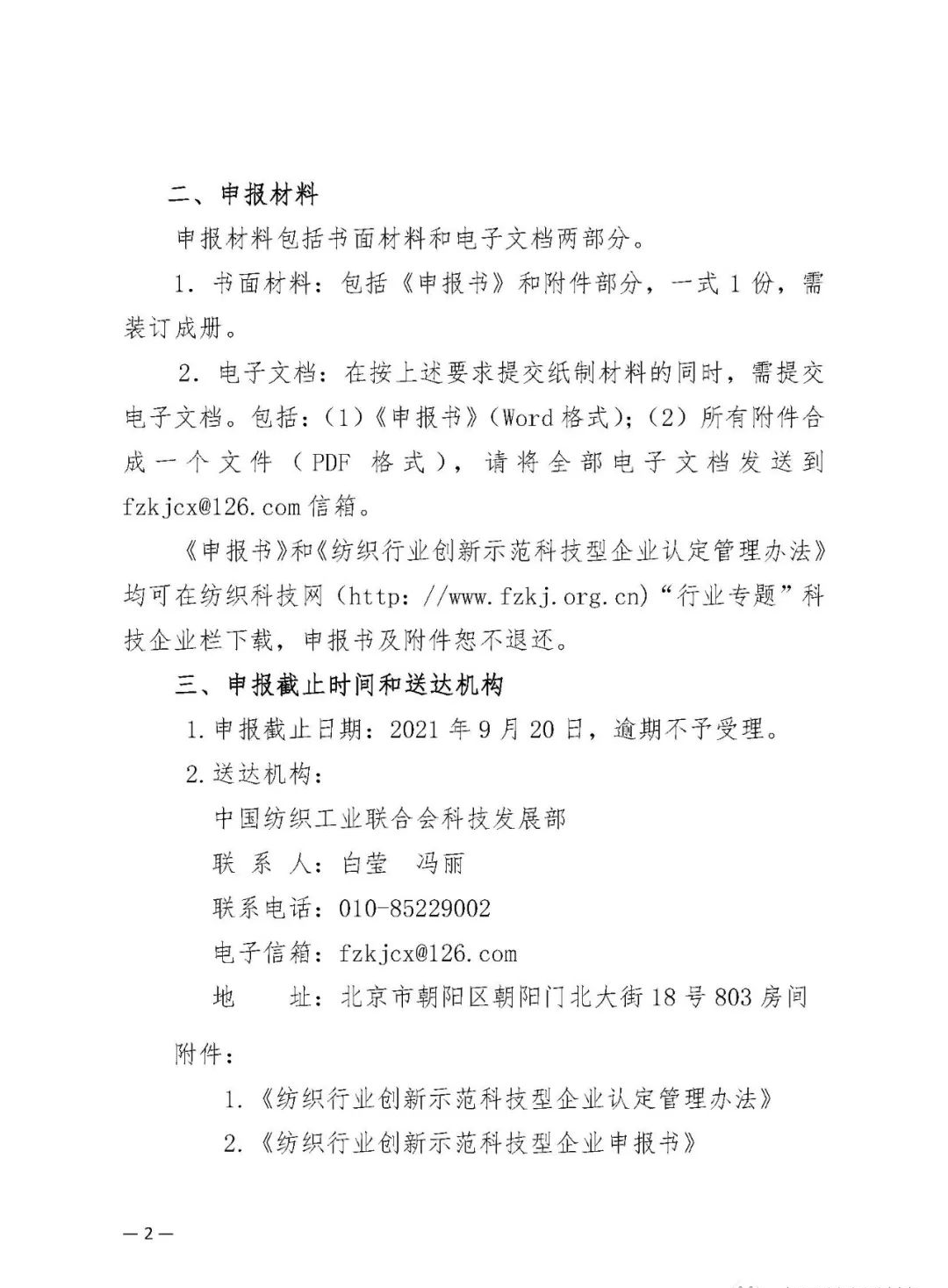 中国纺织工业联合会近日已启动2021年纺织行业创新示范科技型企业的申报工作。申报截止日期为2021年9月20日。