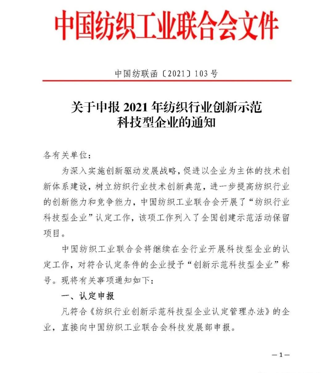 为深入实施创新驱动发展战略,促进以企业为主体的技术创新体系建设,树立纺织行业技术创新典范,进一步提高纺织行业的创新能力和竞争能力,中国纺织工业联合会开展了“纺织行业科技型企业”认定工作,该项工作列入了全国创建示范活动保留项目。
