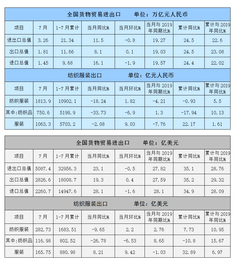 2021年1~7月,纺织服装累计出口1683.51亿美元,增长7.73%,比2019年增长10.95%,其中纺织品出口802.52亿美元,下降10.80%,比2019年增长15.67%,服装出口880.98亿美元,增长32.89%,比2019年增长6.97%。