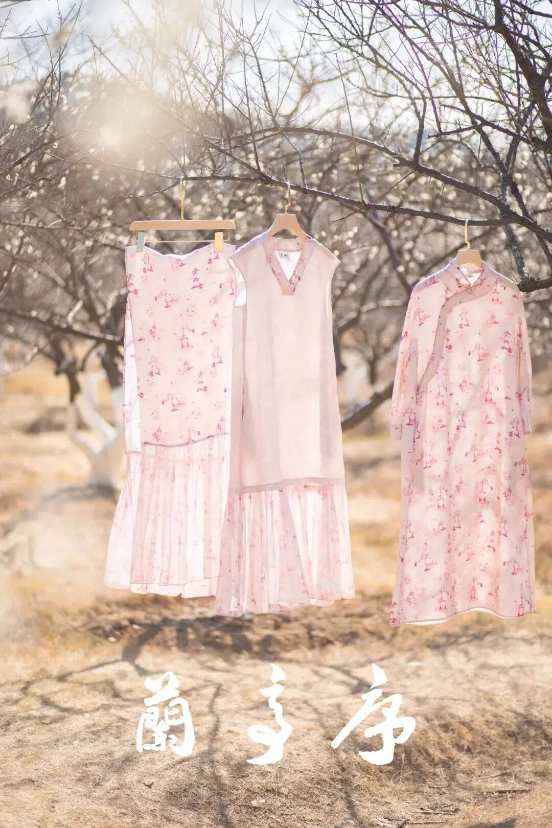 其中《兰亭序》系列提取中国山水画的元素,手绘亭台、树木、花草与蝴蝶等意象,印染在斜纹绸和乔其纱面料之上,再结合调整传统的对襟马褂款式,削弱马褂原有的阳刚之气,直线型门襟、风琴位与大翻袖的呼应设计,在极简的廓形中增添了穿着的层次感。