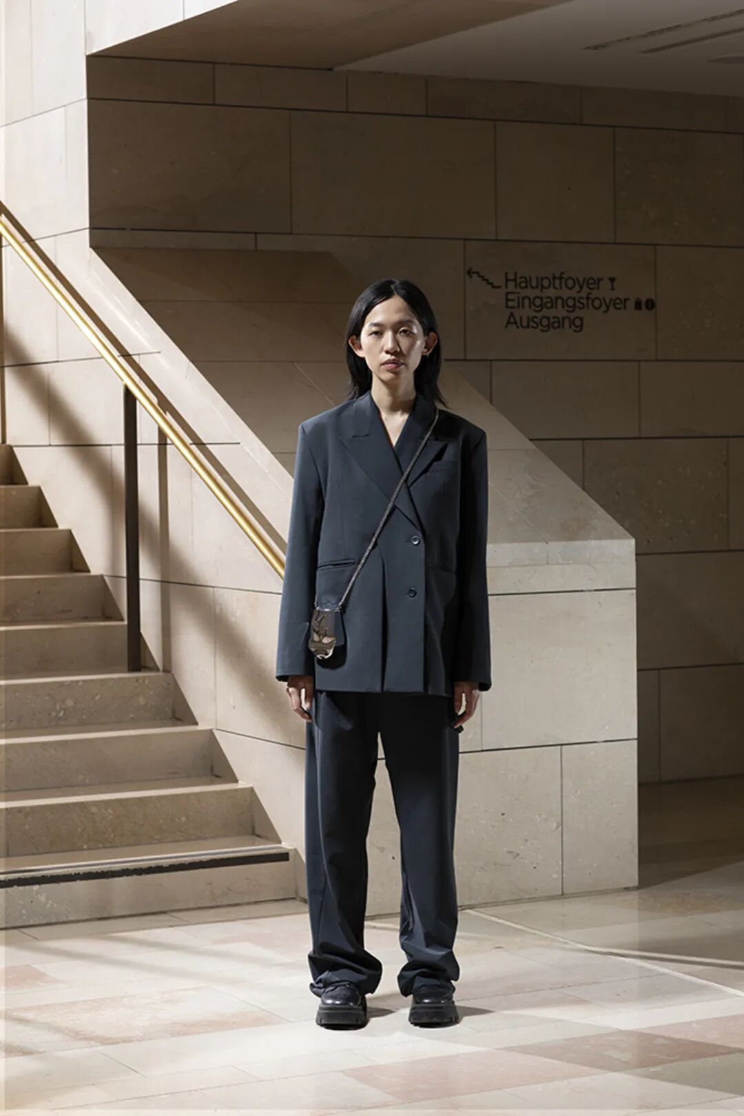 用开衩等解构细节更新便西,营造低调现代感。用量感飘逸版型的长裤打造休闲外观。