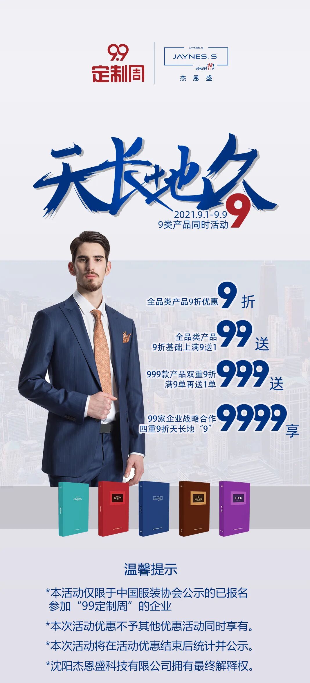 中国服装行业“9.9定制周”是由中国服装协会定制专业委员会联合杭州贝嘟科技有限公司(衣邦人)于2021年1月共同发起倡议,致力打造服装定制的全行业品质购物节。活动一方面旨在通过“定制周”向广大消费者推广普及服装定制文化,另一方面希望通过传播的合力和活动促销进一步加大公众影响,提升零售商和供应商的订单量,推动整个供应链体系顺畅合作,形成整个服装定制产业的良性联动效应。