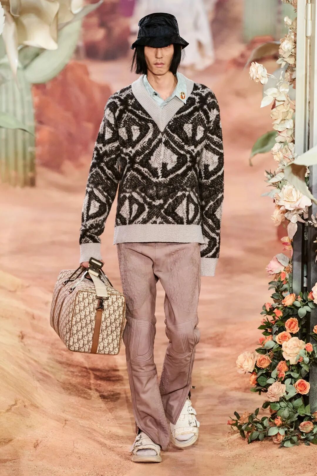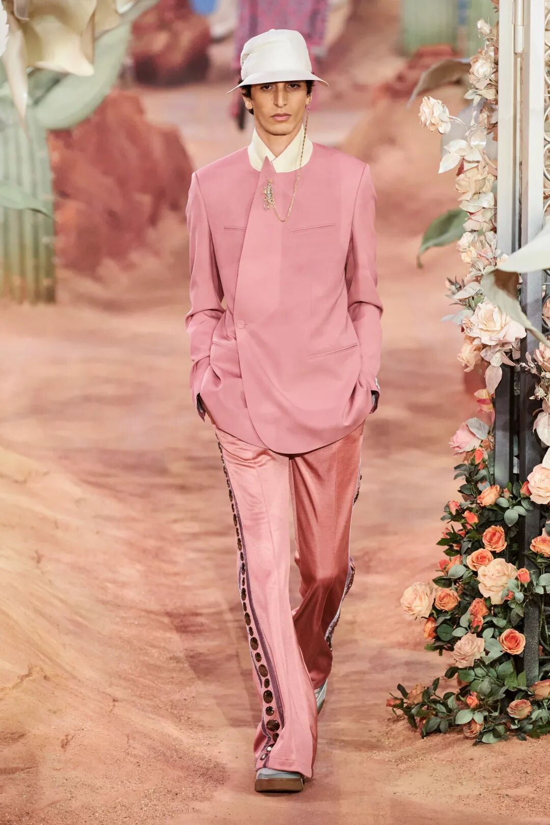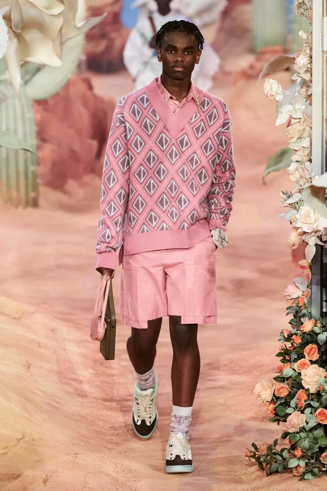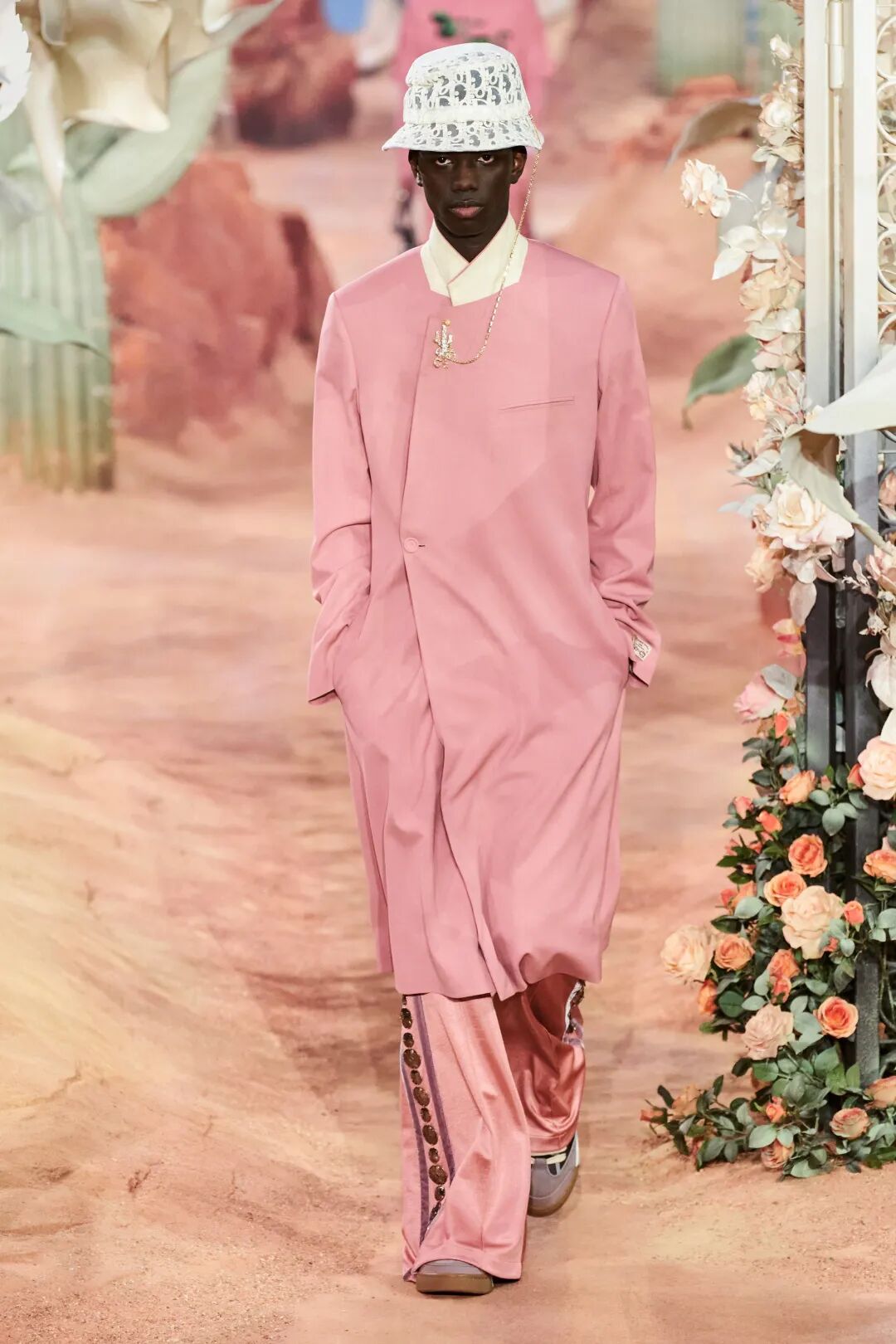 从秀场布置到服装设计,整个2022男装都充满着这梦幻的模样。女性化的、柔化的调调让许多设计师着迷,因此Louis Vuitton、Jil Sander、Dior、Loewe不约而同选择了粉色。不同的明度与纯度也让粉红泡泡散发着不同的光芒。