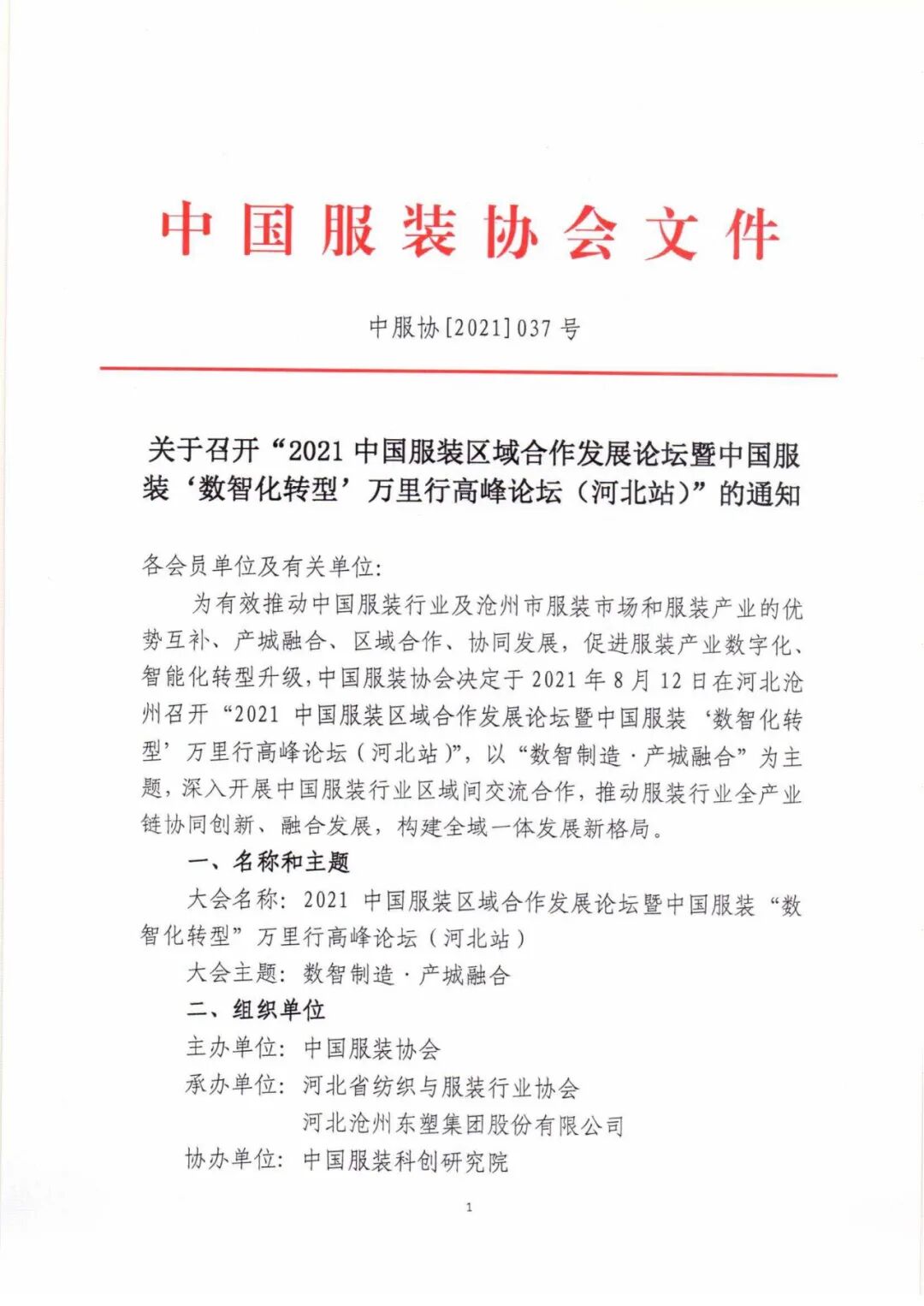 大会名称:2021中国服装区域合作发展论坛暨中国服装“数智化转型”万里行高峰论坛(河北站)