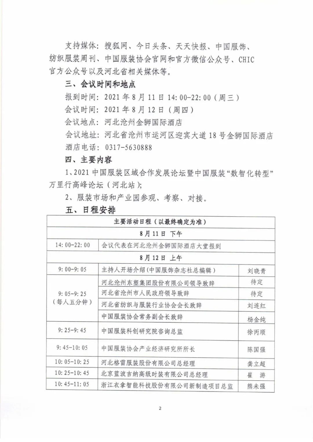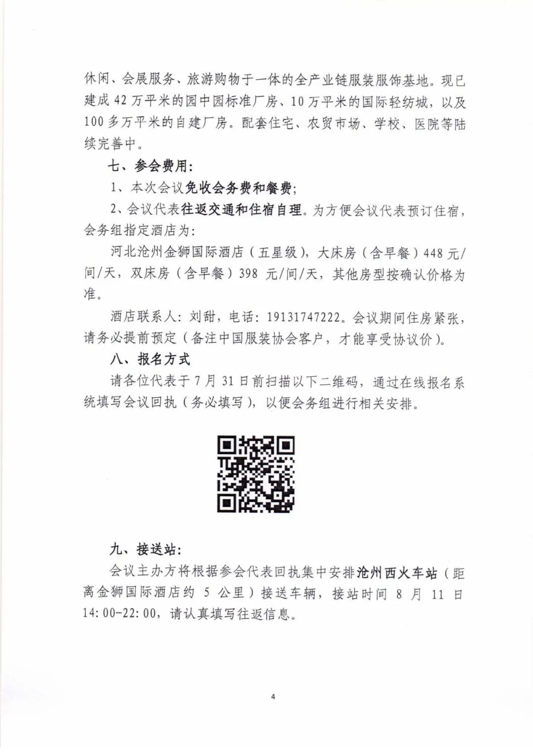 2、会议代表往返交通和住宿自理。为方便会议代表预订住宿,会务组指定酒店为:河北沧州金狮国际酒店(五星级),大床房(含早餐)448元/间/天,双床房(含早餐)398元/间/天,其他房型按确认价格为准。酒店联系人:刘甜,电话:19131747222。会议期间住房紧张,请务必提前预定(备注中国服装协会客户,才能享受协议价)。八、报名方式