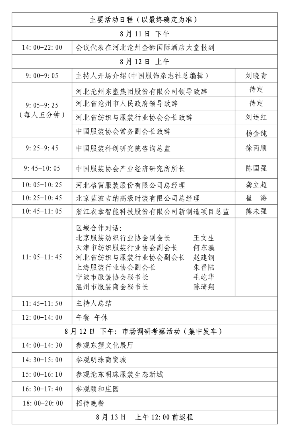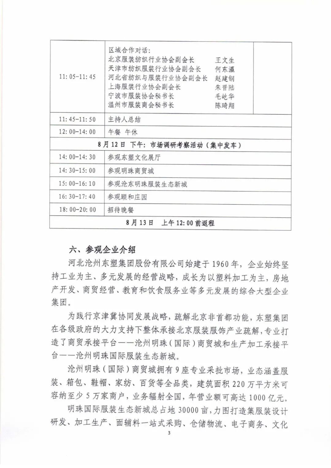河北沧州东塑集团股份有限公司始建于1960年,企业始终坚持工业为主、多元发展的经营战略,成长为以塑料加工为主,房地产开发、商贸经营、教育和饮食服务业等多元发展的综合大型企业集团。为践行京津冀协同发展战略,疏解北京非首都功能,东塑集团在各级政府的大力支持下整体承接北京服装服饰产业疏解,专业打造了商贸承接平台——沧州明珠(国际)商贸城和生产加工承接平台——沧州明珠国际服装生态新城。沧州明珠(国际)商贸城拥有9座专业采批市场,业态涵盖服装、箱包、鞋帽、家纺、百货等全品类,建筑面积220万平方米可容纳至少5万家商户,业务辐射全国,年营业额可高达1000亿元。明珠国际服装生态新城总占地30000亩,力图打造集服装设计研发、加工生产、面辅料一站式采购、仓储物流、电子商务、文化休闲、会展服务、旅游购物于一体的全产业链服装服饰基地。现已建成42万平米的园中园标准厂房、10万平米的国际轻纺城,以及100多万平米的自建厂房。配套住宅、农贸市场、学校、医院等陆续完善中。七、参会费用: