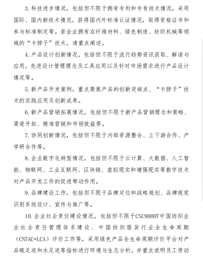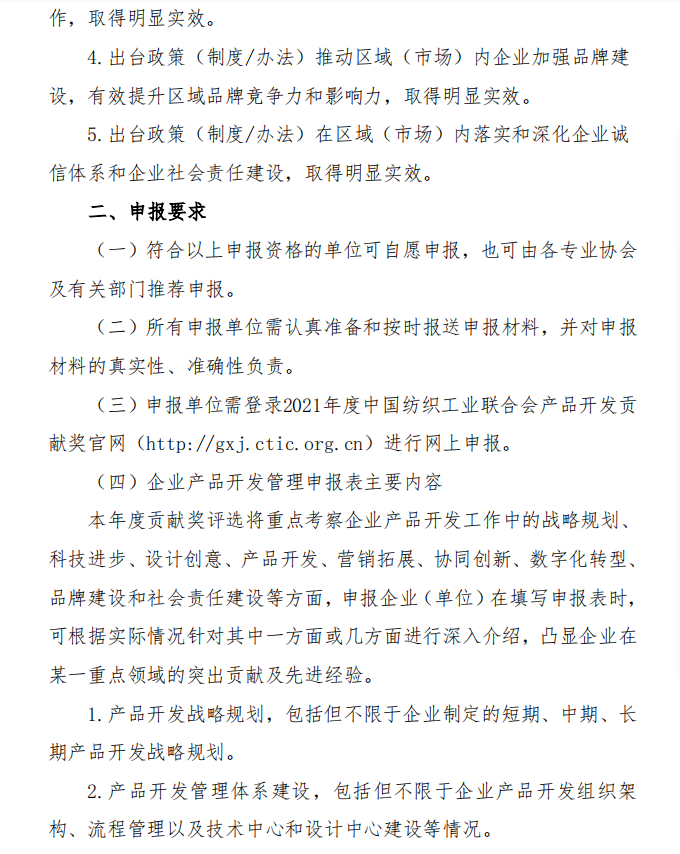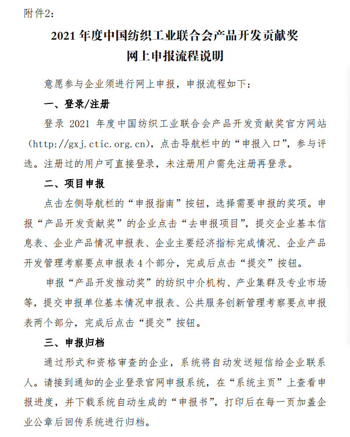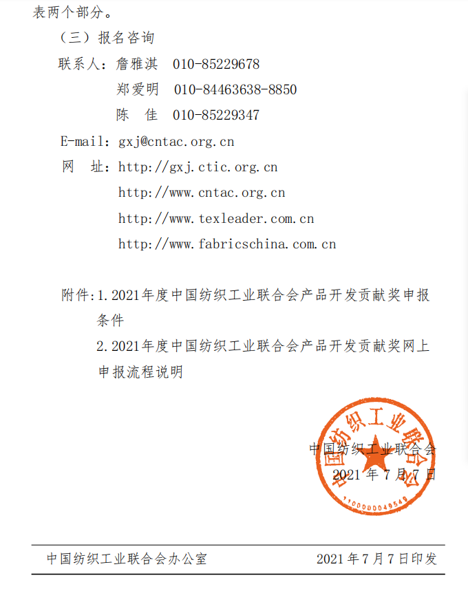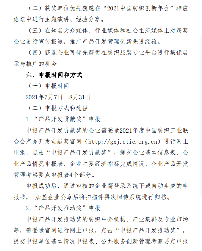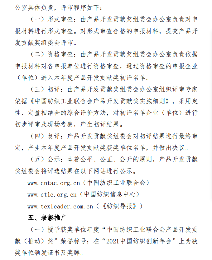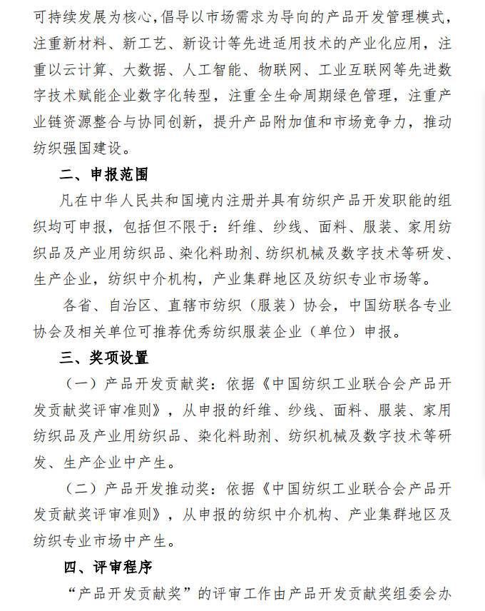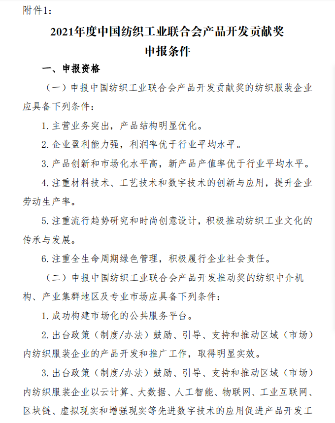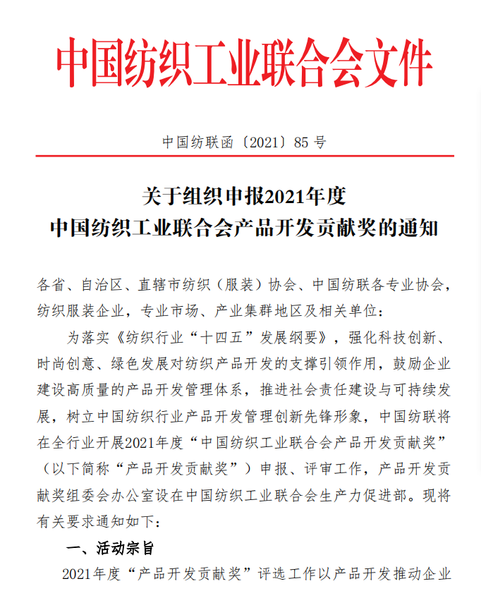 为落实《纺织行业“十四五”发展纲要》,强化科技创新、时尚创意、绿色发展对纺织产品开发的支撑引领作用,鼓励企业建设高质量的产品开发管理体系,推进社会责任建设与可持续发展,树立中国纺织行业产品开发管理创新先锋形象,中国纺联将在全行业开展2021年度”中国纺织工业联合会产品开发贡献奖”申报、评审工作,欢迎广大服装企业、产业集群积极申报。通知全文如下: