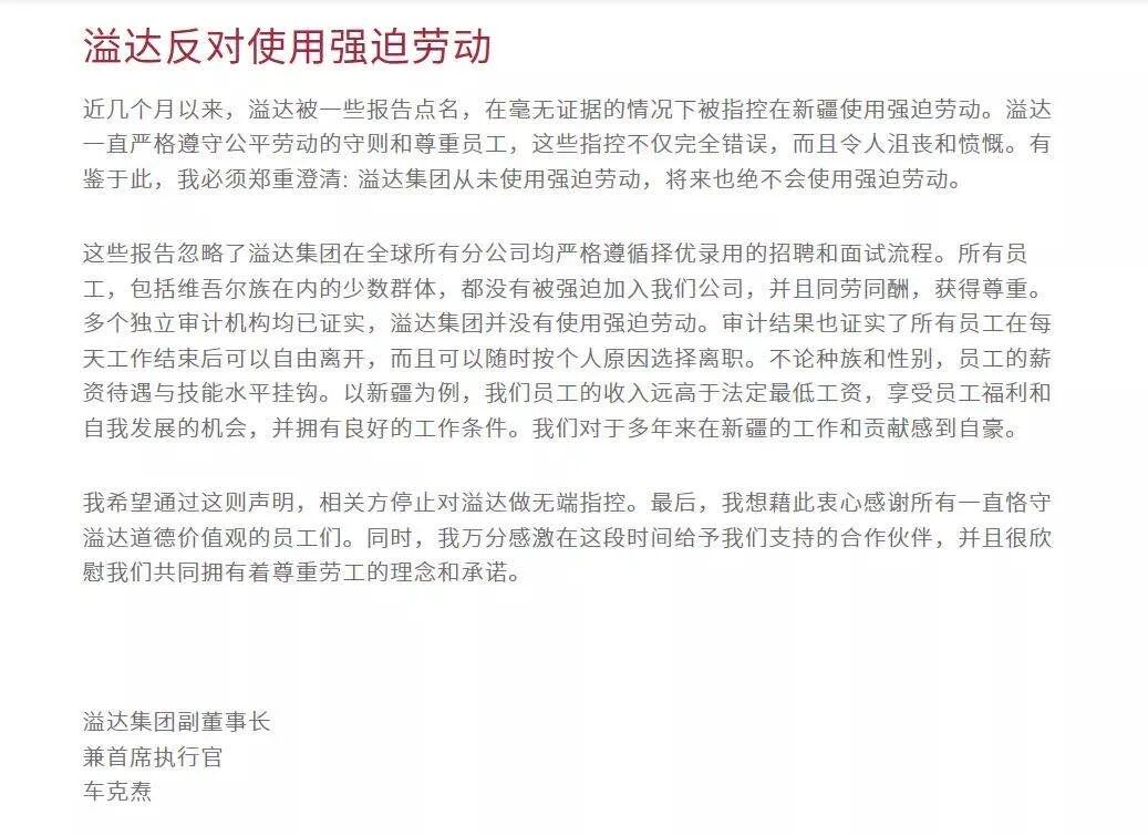 彼时,溢达集团回应称,对美国商务部的决定深感愤慨。在溢达,无论过去、现在,或者未来也绝不会使用强迫劳动。有关昌吉溢达使用强迫劳动的指控,这是完全没有事实根据。于2009年成立的昌吉溢达,是一家全流程智能化纺纱厂,一线员工工资是当地最低工资的2~3倍以上。2019年,一家知名的国际审计机构曾到昌吉溢达作独立调查,并确认不存在强迫劳动。关于举办“纺织之光”服装行业数字化重点技术成果推广活动的通知“三孩政策”到底给童装行业带来什么?不仅仅是新增市场那么简单!请来韩寒、李诞代言打造年轻化新形象,利郎男装上半年零售增幅超25%