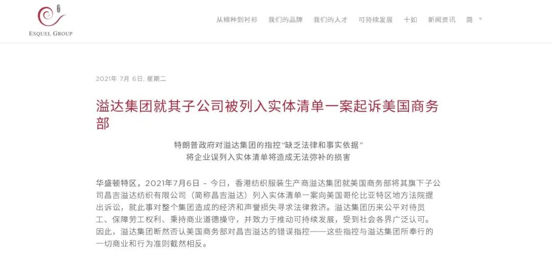 7月6日,据溢达集团官网发布:就美国商务部将其旗下子公司昌吉溢达纺织有限公司(简称昌吉溢达)列入实体清单一案向美国哥伦比亚特区地方法院提出诉讼,就此事对整个集团造成的经济和声誉损失寻求法律救济。