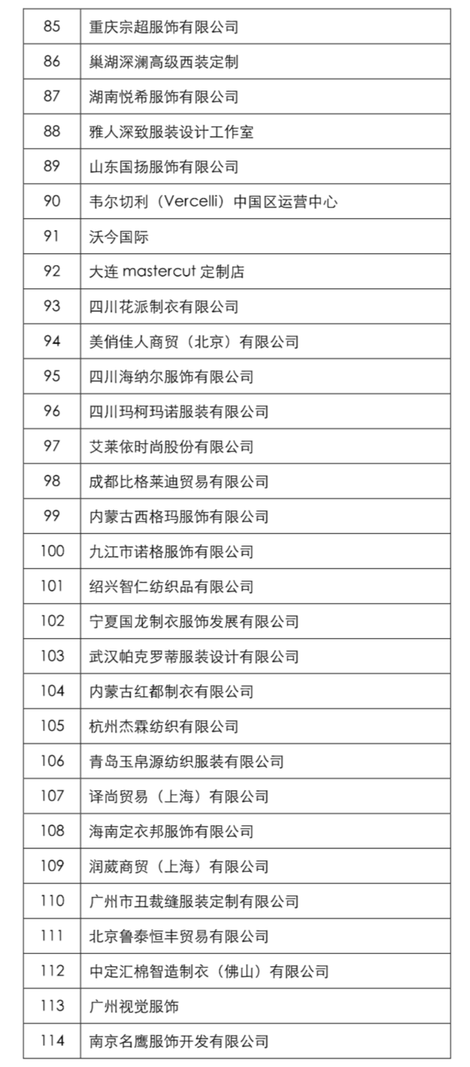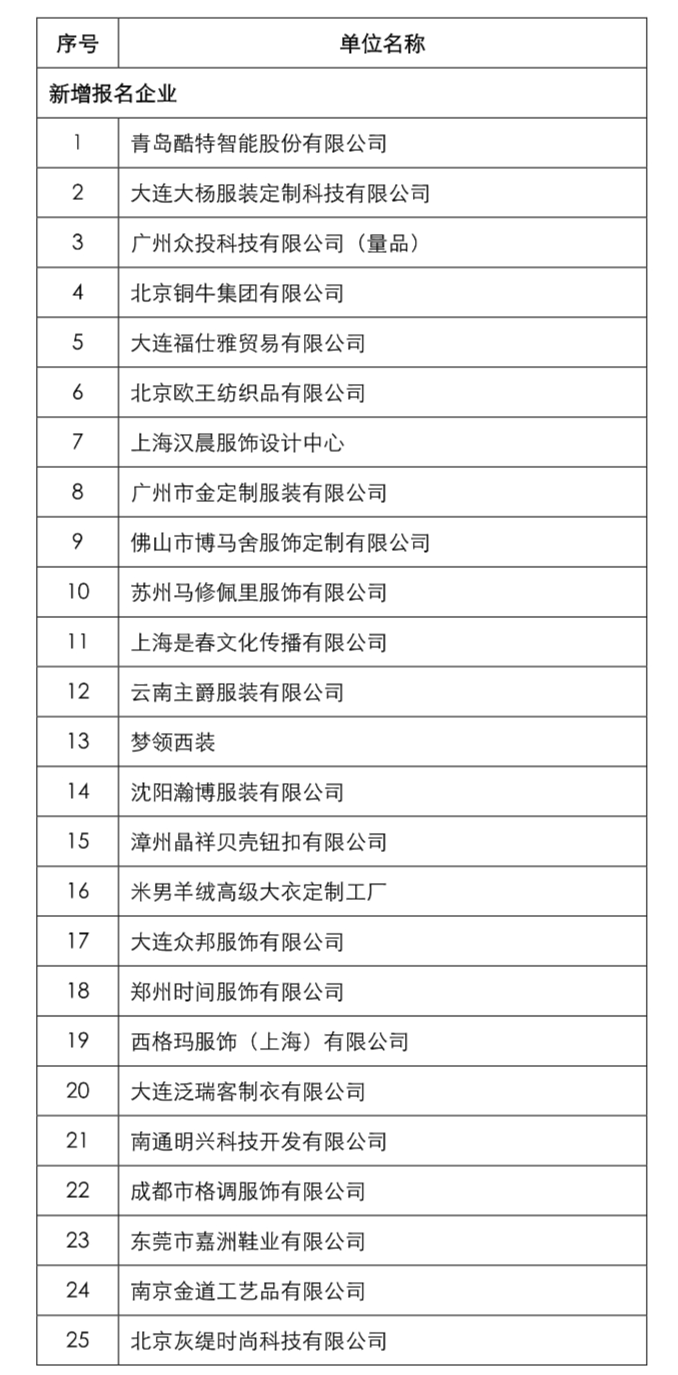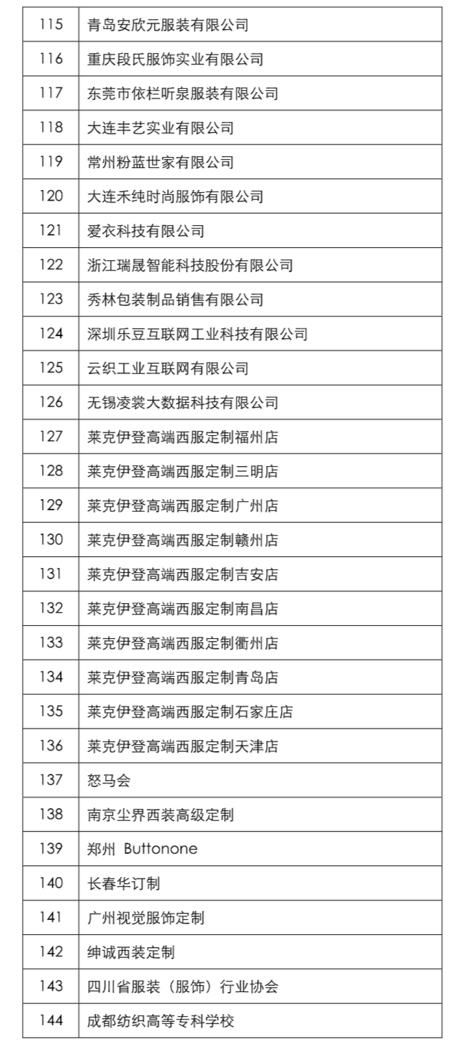 6月25日首次公布“9.9定制周”报名企业名单,经过一周时间又增加酷特、大杨、量品、铜牛等25家报名企业。截至目前,共有144家从事服装定制相关企业和个体定制店报名参与,以下是目前报名参与企业名单(排名不分先后):
