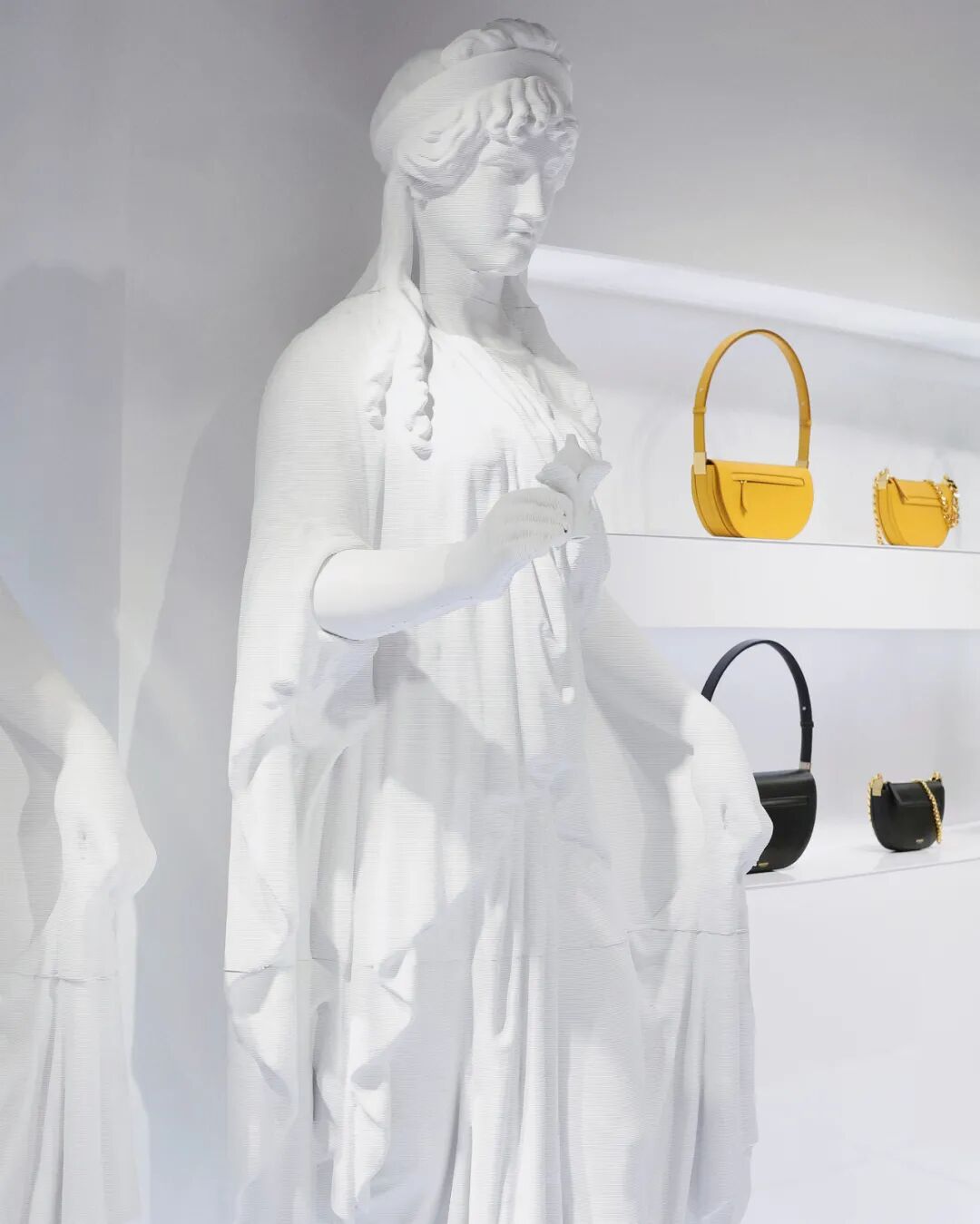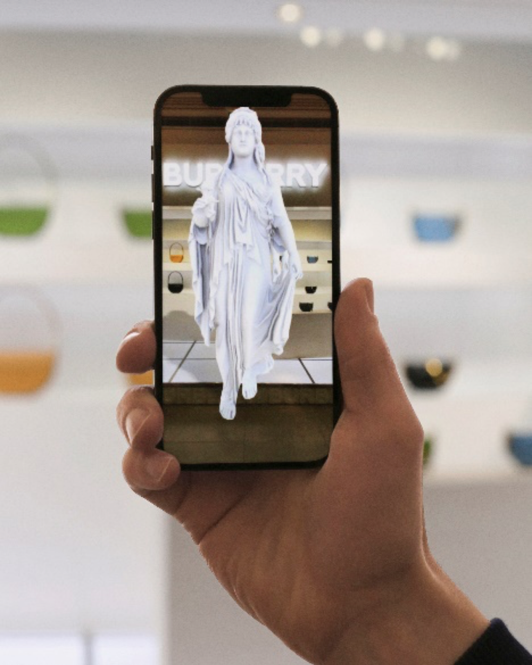 通过彩色 FF Vertigo 黄色帐篷、吧椅、绿色草坪地面等空间陈设增添“室内露营”的真实感。在 Fendi Caffe 上海 ifc 限时体验空间,夏季胶囊系列除了男女装和手袋产品外还推出了站立式桨板、滑板以及 Fendi 与宝丽来特别合作款 OneStep Close-Up 600 系列复古拍立得相机等产品,并与 Lady M 合作提供千层蛋糕、闪电泡芙、马卡龙等餐饮外带服务,为奢侈品所塑造的生活场景增添更多趣味性。Fendi 限时体验空间,上海 IFC 国金中心商场为了凸显品牌标志性包款 Olympia 的设计美学和工艺,以及古典主义现代诠释的创作概念,日前英国奢侈品牌 Burberry 在全球推出了一系列限时精品店,围绕包款的建筑美感和女性气质,在展示空间融入古希腊雕塑元素。同时运用增强现实技术在现实精品店中推出 AR 体验,访客在扫描二维码后便能够看到雕像的动态影像,并留下一连串的动作序列雕像。使消费者在线下场景中体验真实产品和空间,又能感受只有在“真实空间”中才能体验的虚拟世界。Burberry Olympia 限时精品店 AR 体验而至于如 Louis Vuitton、Bottege Veneta、Gentle Monster 等等越来越多奢侈品牌在中国各具特色的城市相继推出限时精品店,除受二线城市奢侈品消费活力驱动外,以成都为例其古蜀文明的地域特色、当地慢节奏的生活氛围,一方面在消费者心中进一步加深了品牌与中国在地文化的贴近,另一方面也通过线下场景为品牌塑造出更多元的价值理念和生活方式。