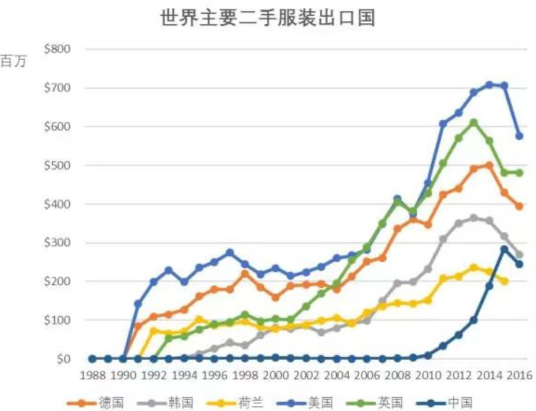 假设,平均每个中国人一年会购置 10 件新衣,其中 3-5 件会被丢弃,每年被丢弃的衣服就会有 40-70亿件,5000 万吨左右。巨量的旧衣会去哪里?能产生什么样的价值?第一站,或许是闲鱼二手交易,C2C 业务体量小,成交不确定,产生的价值也不确定,但不论是多大价值,都在两个人之间完成,所以不具备广泛的市场流通性,先暂不计。第二站,可能是垃圾箱。而垃圾箱里的任何“垃圾”都会被拣选分类,衣服可能也不例外。但,第一大多数都会被焚烧,第二即使处理也会需要更大代价变废为宝。第三站,旧衣回收。按照旧衣回收产业的标准,未经分拣、挑选过的旧衣服的统称为“统货”,夏装统货回收的价格每吨 3900 元到 6300 元不等,冬装统货的价格每吨 500 元到 900 元不等。旧衣被收集之后会经历运输、清洁、消毒、熨烫,然后分类打包跨国运输、低价售卖那么,5000 万吨的价值是多少?在服装领域,旧衣回收正在撑起千亿级规模庞大市场。实际上,旧衣回收是一条存在已久、完整、分工明确的产业链。当旧衣被回收之后,运输、清洁、消毒、熨烫、跨国运输、低价售卖……由此,一件旧衣完成了它从商场柜台或者线上橱窗之后的第二次价值变现。据联合国官网获得的贸易数据显示:2018 年,全球二手服装总进口量达 41 亿美元,其中非洲市场,消化了 13 亿美元。这意味着全球二手服装 1/3 以上,最终进口到了非洲。但,这些服装来自哪里?20 世纪初,英国、美国、德国、日本等国家就通过法律来支持和鼓励废旧纺织品的再生利用了。英国的纺织品回收协会数据显示,2010 年中国二手服装出口在全球占比不到 1%,2015 年升 6.4%。其中许多流向非洲。在过去 10年前运往肯尼亚的二手服装中,英国供应占 1/4。如今,中国是最大供应方,约占 30%。作为人口大国,中国确实在二手衣物输出国中占据较大体量,但其实,在旧衣回收领域真正赶早的是美国、英国、德国和韩国。中国每年丢弃的衣物中,只有不到 10%被回收再利用。回收率不到 10%的中国旧衣回收产业,目前仍处于早期阶段。一方面,中国旧衣回收产业体系已经相当完备,上下游布局合理、分工明确。其中接近三成的旧衣服会被出口到非洲、东南亚等地区,其中非洲占比最高——在全球二手服装总进口量达 41 亿美元的 2018 年,中国出口了 2.8 亿美元二手服装,其中 70%以上销往了非洲市场。余下的七成则会在国内市场循环利用。旧衣服行业的某个门类或者某个产业链条,国内已经自主形成多个专业回收中心与之相配合。另一方面,虽然最近几年旧衣回收产业蓬勃发展,但基本上仍然处于地下产业链。根据天眼查提供数据显示,从事旧衣行业的企业数量从 2016 年总共 262 家,增长到 2017 年总量 359 家,2018 年总量 569 家,2019 年 11 月达到 830家,新增 261 家。今天,在天眼查搜索旧衣回收相关企业,数量已经更新至:1097。其中一些较为成熟的企业和组织如走进社区“小黄狗”,或者在线上做旧衣回收的飞蚂蚁、白鲸鱼、欧燕、铛铛,联合支付宝、闲鱼、京东等线上大平台,线上预约,免费取件,而后这些旧衣被回收之后会有四大流向:出口转售(占比最高,达到 70%)、环保再生(占比 20%)、山区捐赠、工艺再造。但是,除了登记注册的旧衣回收企业,市场上仍然充斥着大量个体和以捐赠唯有的组织在从事旧衣回收事业。当我们在倡导和践行可持续的时候,那些并不是很可持续的商品该被如何利用,才能变得稍微可持续?非可降解纤维在突然中分解需要经历漫长周期,焚烧会产生空气污染。中国循环经济协会数据显示:中国每年大约有 2600 万吨旧衣服被扔进垃圾桶。如果这些旧衣通过焚烧处理,将造成浪费和污染;进行填埋,会对土壤造成影响。另据艾伦·麦克阿瑟基金会数据显示:服装行业约占全球碳排放总量的 10%,超过航空业和海运业碳排放的总和。每回收再利用 1 公斤衣物就能减少排放 3.6 公斤二氧化碳,节省 6000 升水、0.3 公斤化肥和 0.2 公斤杀虫剂。实际上,旧衣回收是时尚行业释放压力的重要途径。一方面,二手服装交易有助于防止时装业的过剩库存被直接扔进垃圾填埋场;另一方面,消费者淘汰累计在衣柜里常年不穿的旧衣,购买新衣,才能消化品牌们用心打造的新品。所以,优衣库早在 2006 年就启动了“全部商品循环再利用”活动,向消费者无偿回收自己品牌的服装,进行二次穿着、纤维材料再利用或能源化处理。这样一个巨大价值的产业链,未来值得被更多品牌加入和利用。
