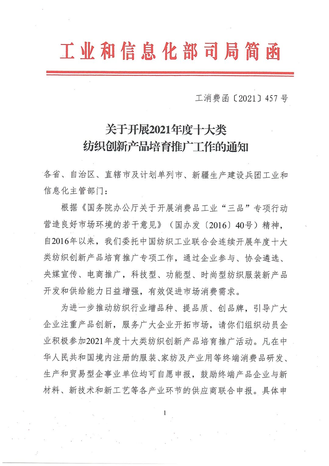 近日,工业和信息化部消费品工业司下发了“关于开展2021年度十大类纺织创新产品培育推广工作的通知”。文件指出,自2017年以来,十大类纺织创新产品培育推广专项工作持续开展,通过企业参与、协会遴选、央媒宣传、电商推广,科技型、功能型、时尚型纺织服装新产品开发和供给能力日益增强,有效促进和满足市场消费需求。