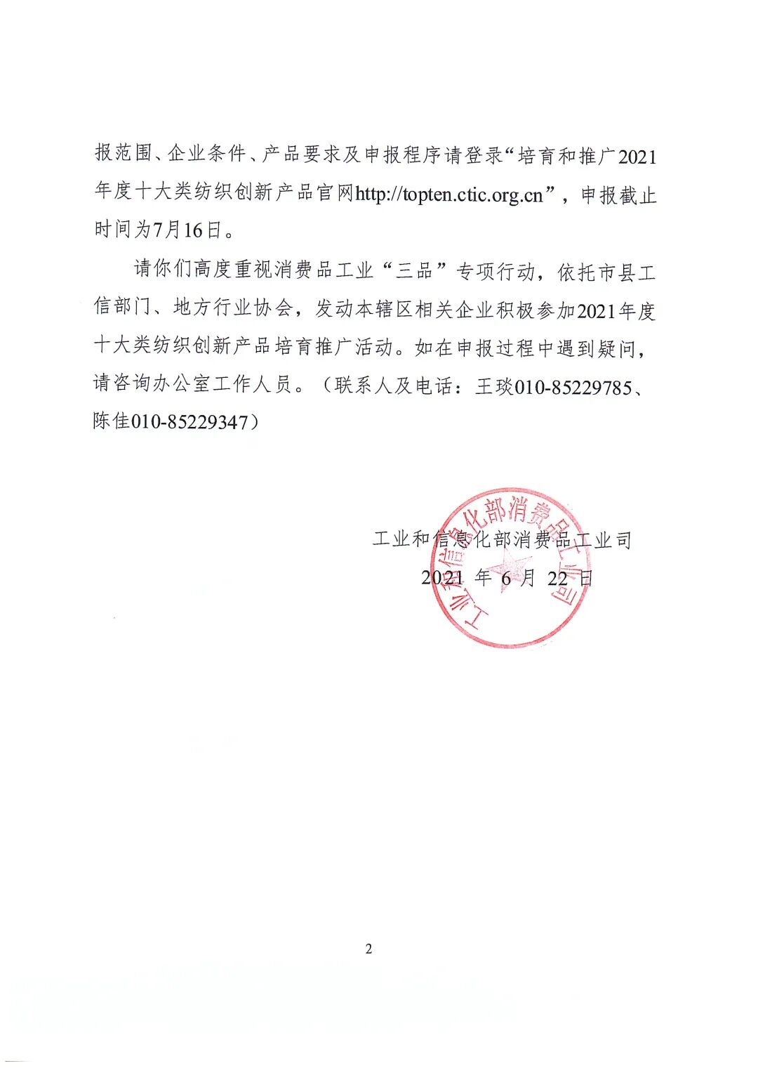 培育和推广2021年度十大类纺织创新产品的申报通道将于7月16日关闭,请意向申报企业登录官网(http://topten.ctic.org.cn)进行线上申报。