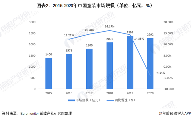目前,我国拥有童装企业逾万家,产业集群主要分布在广东、浙江、福建等地。我国童装行业品牌化起步晚,从产业周期看,行业仍处在成长期阶段,是目前服装行业最重要的增长力量,尤其是近几年该行业的市场规模实现了快速扩容,2015-2019年,中国童装行业市场规模的复合增速达到了14.32%,2020年受疫情影响行业规模有所下降,达到2292亿元。
