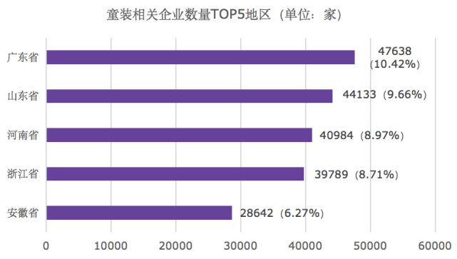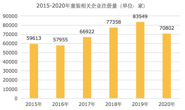 天眼查数据显示,近十年来,童装相关企业总量持续上涨,我国目前有超46万家童装相关企业。其中,2019年,注册量超过8.3万家,增速达到13%。2020年,注册量近7.1万家,增速为10%。从地区分布来看,广东省的童装相关企业数量最多,超过4.7万家。