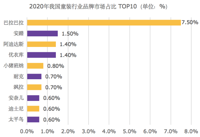 相较成人装,童装时尚度要求低、功能性要求高,企业规模效应更明显,行业集中度预计将会持续提升。目前,森马旗下的巴拉巴拉2020年品牌市场占有率为7.5%,是行业龙头。