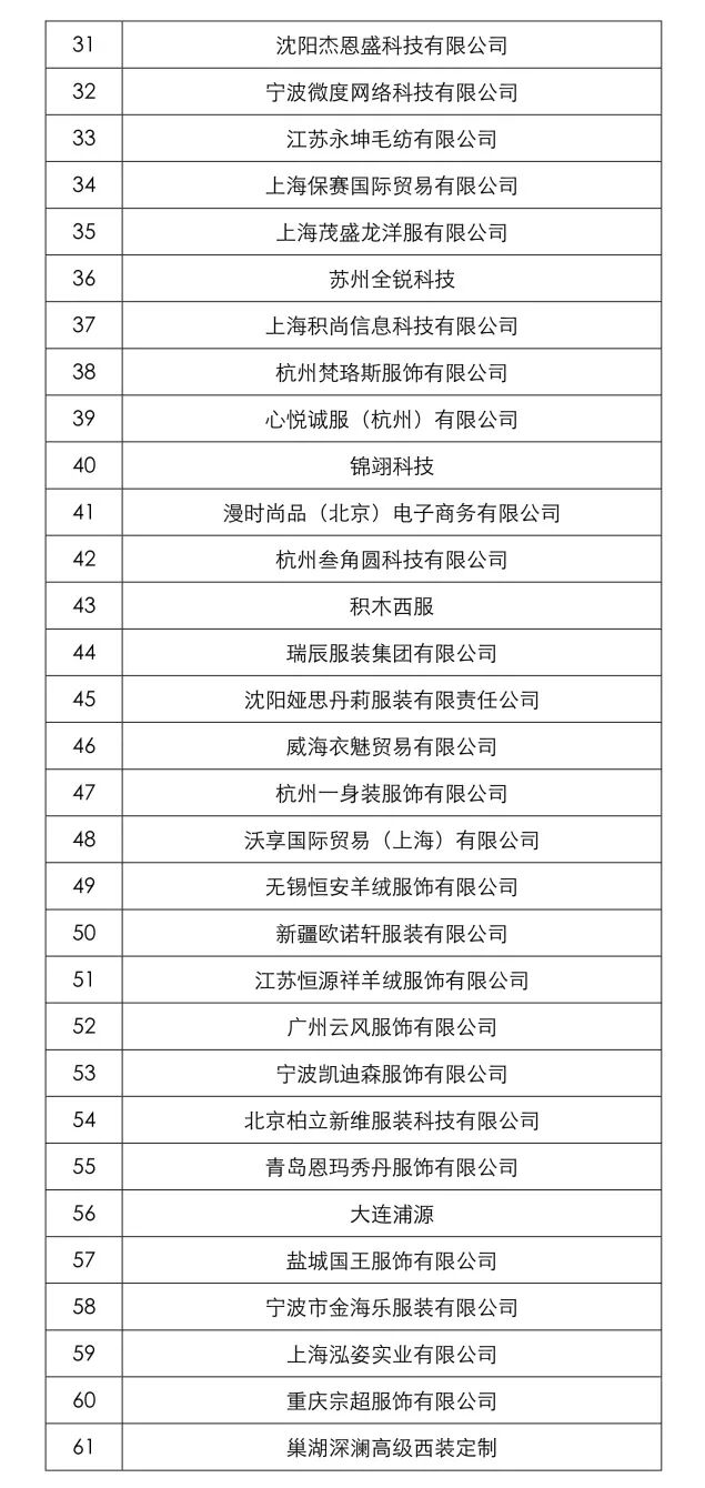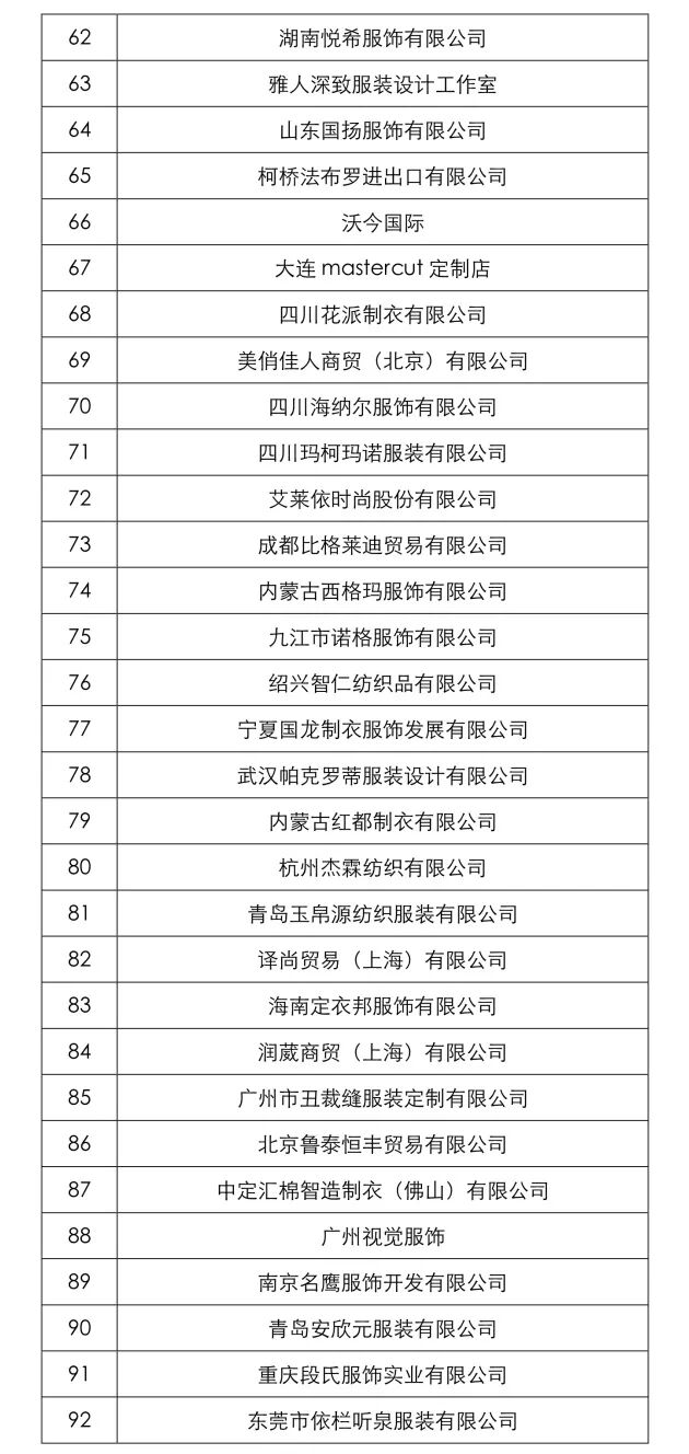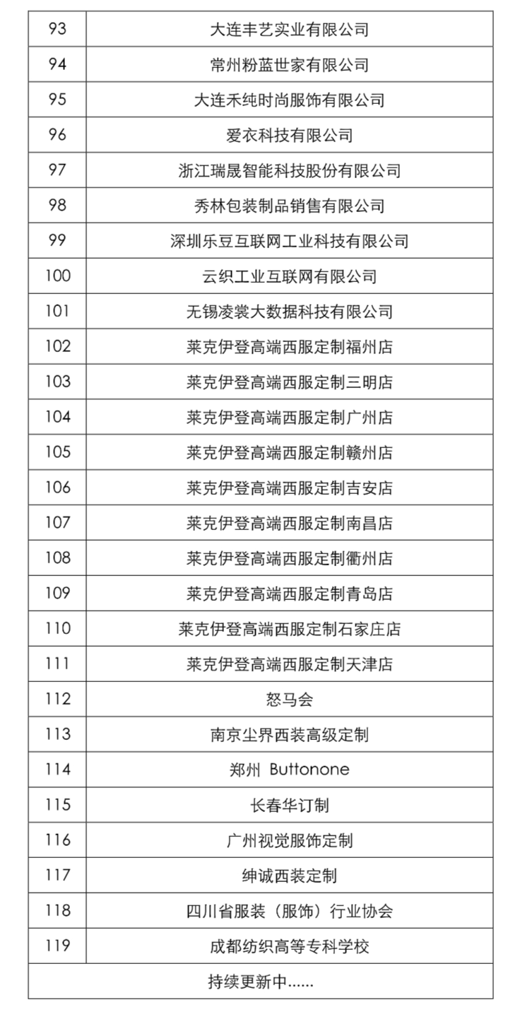 截至目前,共有119家从事服装定制相关企业和个体定制店报名参与,以下是目前报名参与企业名单(排名不分先后):