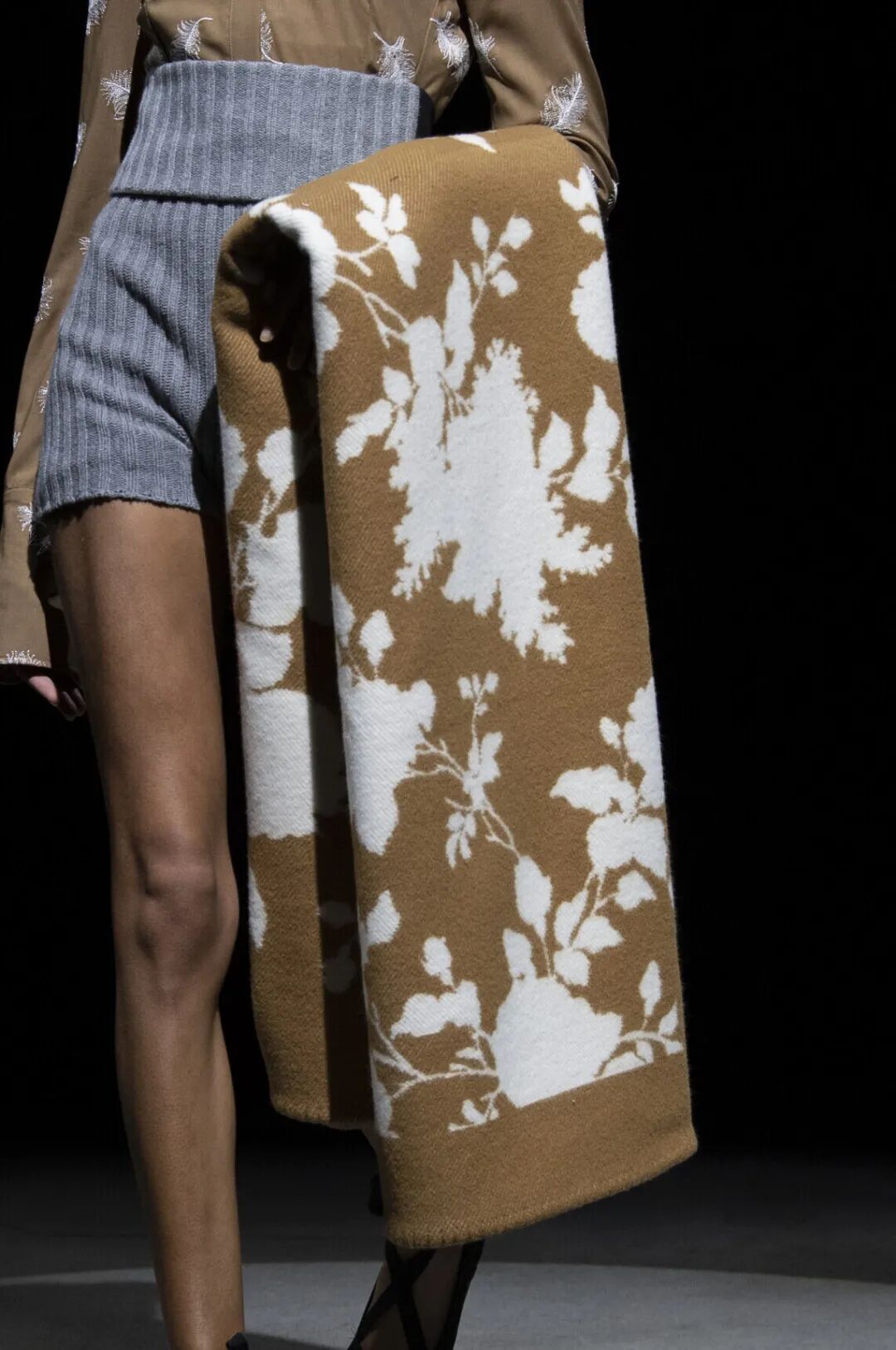 作为2021早秋秀场的关键单品,毯式围巾用途多样,旨在顺应居家、办公以及休闲日益交融的趋势。