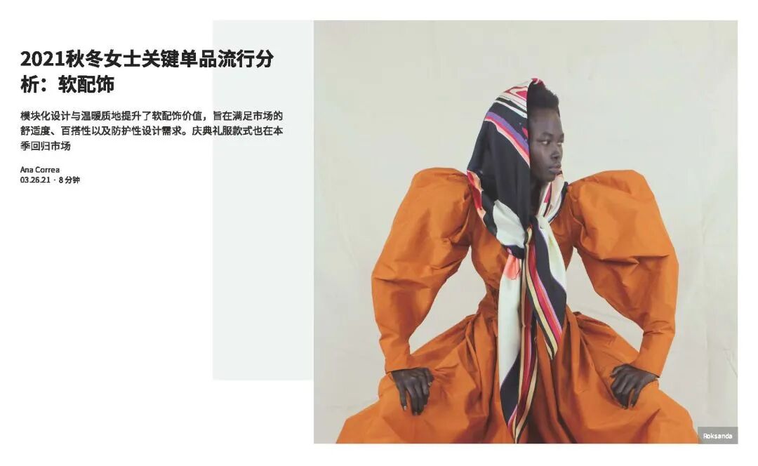 在2021秋冬季,模块化设计与温暖质地提升了软配饰价值,旨在满足市场的舒适度、百搭性以及防护性设计需求,庆典礼服款式也在本季回归市场。